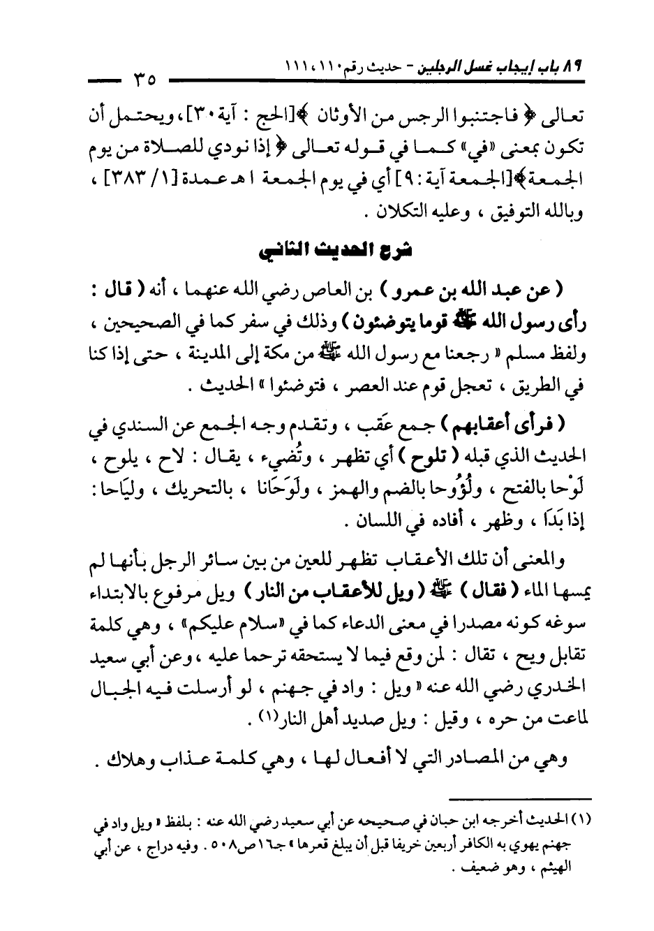 (عن عبد الله بن عمرو) بن العاص رضي الله عنهما، أنه (قال: رأى رسول الله - صلى الله عليه وسلم - قوما يتوضئون) وذلك في سفر كما في الصحيحين، ولفظ مسلم "رجعنا مع رسول الله - صلى الله عليه وسلم - من مكة إلى المدينة، حتى إذا كنا في الطريق، تعجل قوم عند العصر، فتوضئوا" الحديث.