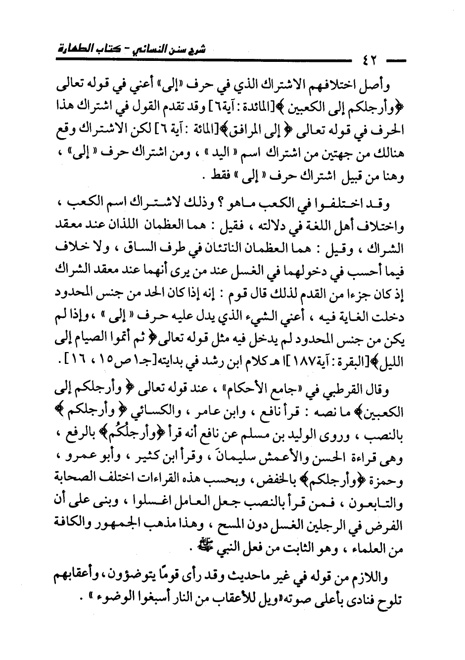 وقال القرطبي في "جامع الأحكام"، عند قوله تعالى {وَأَرْجُلَكُمْ إِلَى الْكَعْبَيْنِ} ما نصه: قرأ نافع، وابن عا مر، والكسائي {وأرجلكم} بالنصب، وروى الوليد بن مسلم عن نافع أنه قرأ {وأرجلُكُم} بالرفع، وهي قراءة الحسن والأعمش سليمانَ، وقرأ ابن كثير، وأبو عمرو، وحمزة {وأرجلكم} بالخفض، وبحسب هذه القراءات اختلف الصحابة والتابعون، فمن قرأ بالنصب جعل العامل اغسلوا، وبنى على أن الفرض في الرجلين الغسل دون المسح، وهذا مذهب الجمهور والكافة من العلماء، وهو الثابت من فعل النبي - صلى الله عليه وسلم -.