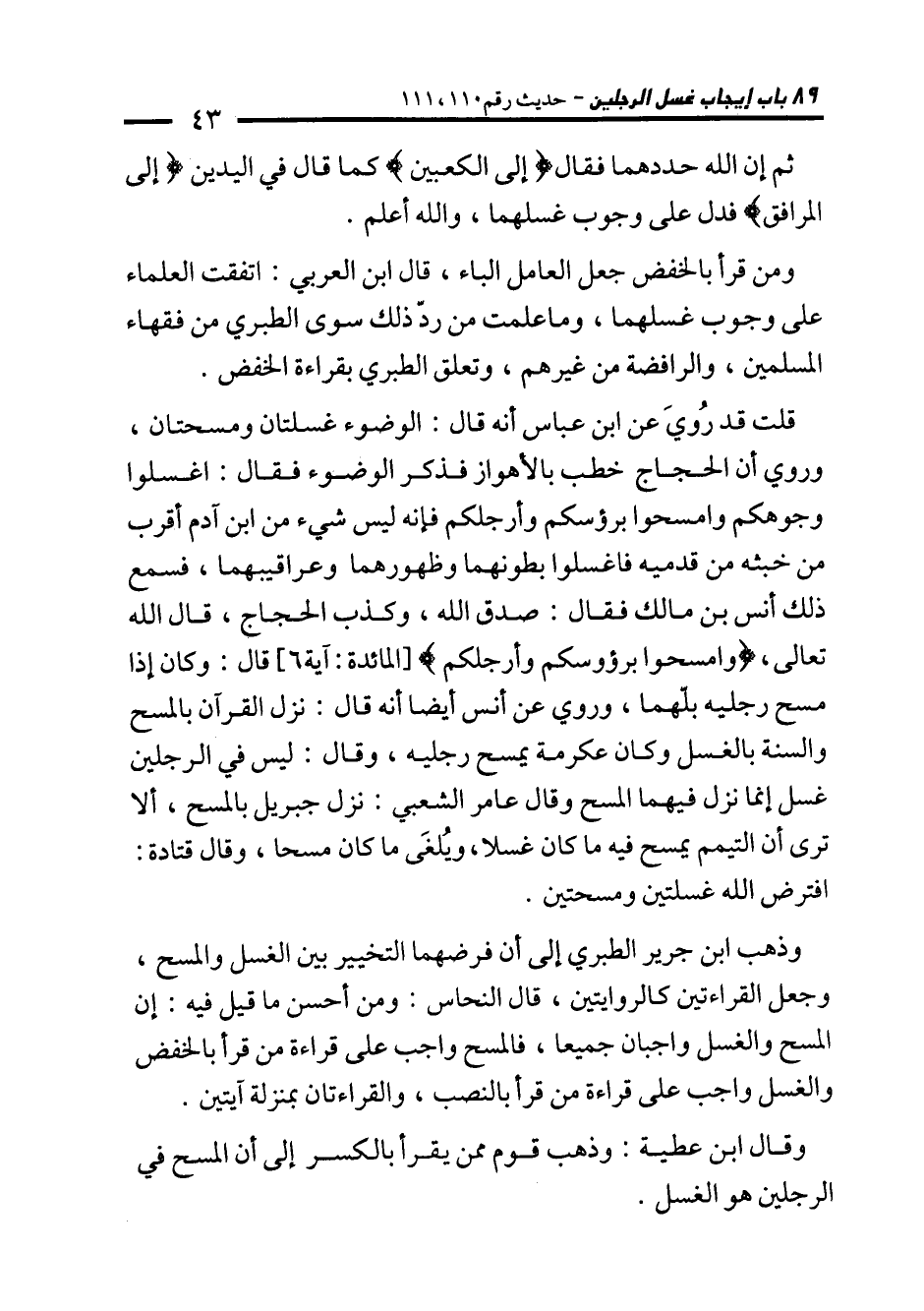 ومن قرأ بالخفض جعل العامل الباء، قال ابن العربي: اتفقت العلماء على وجوب غسلهما، وما علمت من ردّ ذلك سوى الطبري من فقهاء المسلمين، والرافضة من غيرهم، وتعلق الطبري بقراءة الخفض.