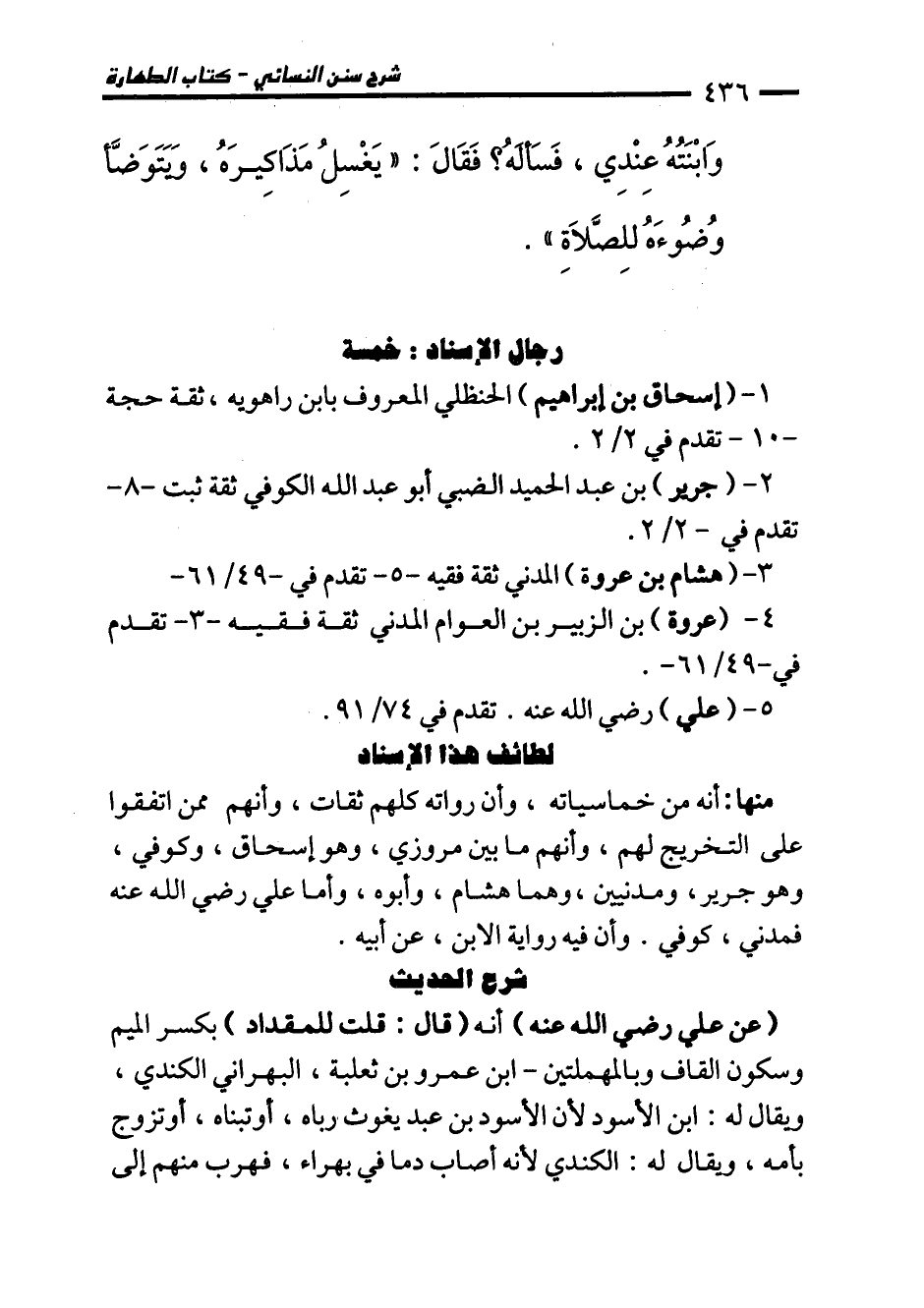 منها: أنه من خماسياته، وأن رواته كلهم ثقات، وأنهم ممن اتفقوا على التخريج لهم، وأنهم ما بين مروزي، وهو إسحاق، وكوفي، وهو جرير، ومدنيين، وهما هشام، وأبوه، وأما علي رضي الله عنه فمدني، كوفي. وأن فيه رواية الابن، عن أبيه.