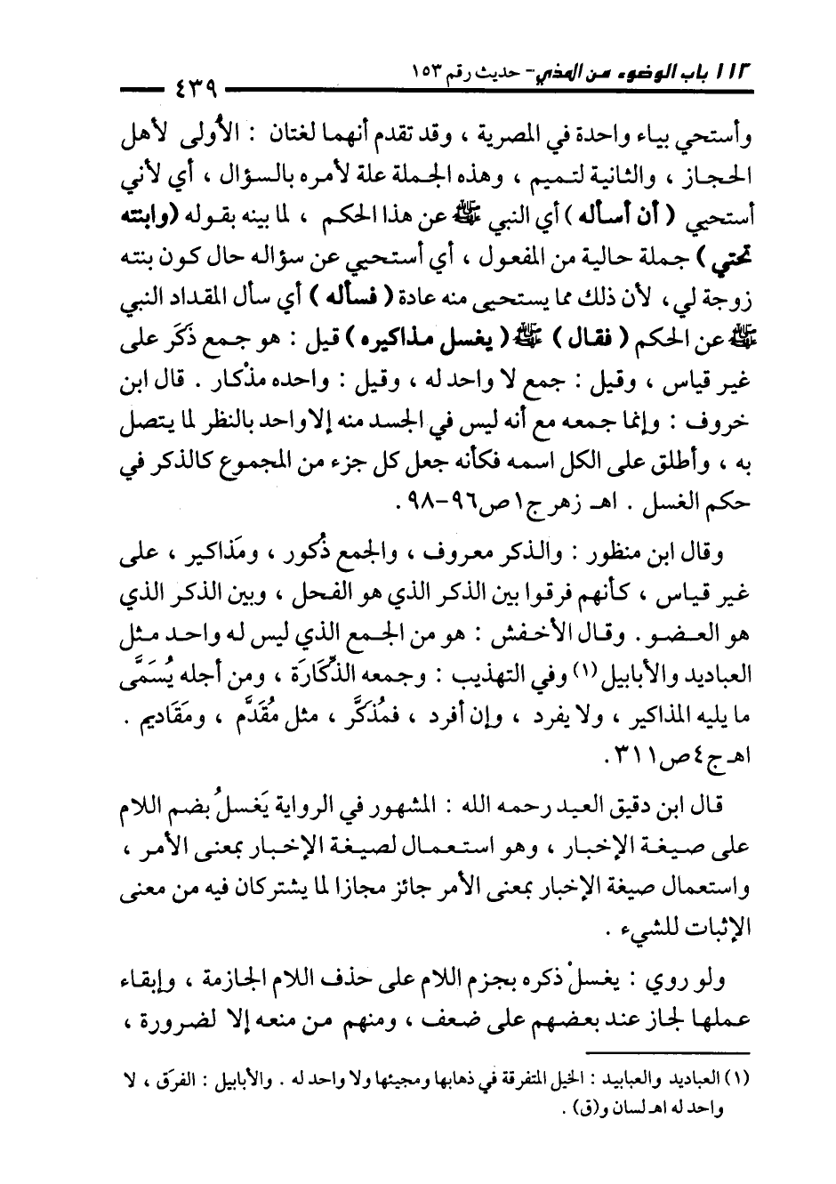 وأستحي بياء واحدة في المصرية، وقد تقدم أنهما لغتان: الأُولى لأهل الحجاز، والثانية لتميم، وهذه الجملة علة لأمره بالسؤال، أي لأني أستحيي (أن أسأله) أي النبي - صلى الله عليه وسلم - عن هذا الحكم، لما بينه بقوله (وابنته تحتي) جملة حالية من المفعول، أي أستحيى عن سؤاله حال كون بنته زوجة لي؛ لأن ذلك مما يستحيى منه عادة (فسأله) أي سأل المقداد النبي - صلى الله عليه وسلم - عن الحكم (فقال) - صلى الله عليه وسلم - (يغسل مذاكيره) قيل: هو جمع ذكر على غير قياس، وقيل: جمع لا واحد له، وقيل: واحده مذْكار. قال ابن خروف: وإنما جمعه مع أنه ليس في الجسد منه إلا واحد بالنظر لما يتصل به، وأطلق على الكل اسمه فكأنه جعل كل جزء من المجموع كالذكر في