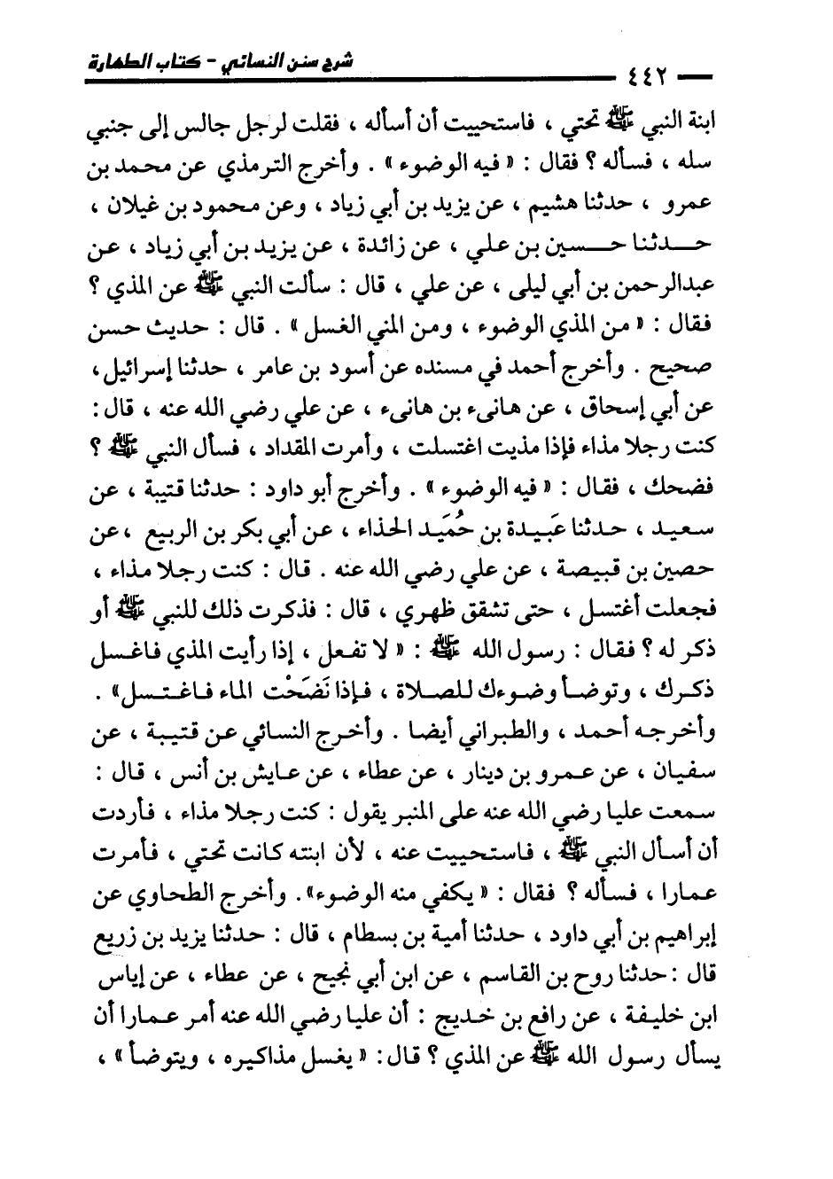 ابنة النبي - صلى الله عليه وسلم - تحتي، فاستحييت أن أسأله، فقلت لرجل جالس إلى جنبي سله، فسأله؟ فقال: "فيه الوضوء". وأخرج الترمذي عن محمَّد بن عمرو، حدثنا هشيم، عن يزيد بن أبي زياد، وعن محمود بن غيلان، حدثنا حسين بن علي، عن زائدة، عن يزيد بن أبي زياد، عن عبد الرحمن بن أبي ليلى، عن علي، قال: سألت النبي - صلى الله عليه وسلم - عن المذي؟ فقال: "من المذي الوضوء، ومن المني الغسل". قال: حديث حسن صحيح. وأخرج أحمد في مسنده عن أسود بن عامر، حدثنا إسرائيل، عن أبي إسحاق، عن هانئ بن هانئ، عن علي رضي الله عنه، قال: كنت رجلا مذاء فإذا مذيت اغتسلت، وأمرت المقداد، فسأل النبي - صلى الله عليه وسلم -؟ فضحك، فقال: "فيه الوضوء". وأخرج أبو داود: حدثنا قتيبة، عن سعيد، حدثنا عَبيدة بن حُمَيد الحذاء، عن أبي بكر بن الربيع، عن حصين بن قبيصة، عن علي رضي الله هـ عنه. قال: كنت رجلا مذاء، فجعلت أغتسل، حتى تشقق ظهري، قال: فذكرت ذلك للنبي - صلى الله عليه وسلم - أو ذكر له؟ فقال: رسول الله - صلى الله عليه وسلم -: "لا تفعل، إذا رأيت المذي فاغسل ذكرك، وتوضأ وضوءك للصلاة، فإذا نَضَحْت الماء فاغتسل". وأخرجه أحمد، والطبراني أيضا. وأخرج النسائي عن قتيبة، عن سفيان، عن عمرو بن دينار، عن عطاء، عن عايش بن أنس، قال: سمعت عليا رضي الله عنه على المنبر يقول: كنت رجلا مذاء، فأمرت أن أسأل النبي - صلى الله عليه وسلم -، فاستحييت عنه؛ لأن ابنته كانت تحتي، فأمرت عمارا، فسأله؟ فقال: "يكفي منه الوضوء". وأخرج الطحاوي عن إبراهيم بن أبي داود، حدثنا أمية بن بسطام، قال: حدثنا يزيد بن زريع قال: حدثنا روح بن القاسم، عن ابن أبي نجيح، عن عطاء، عن إياس ابن خليفة، عن رافع بن خديج: أن عليا رضي الله عنه أمر عمارا أن يسأل رسول الله - صلى الله عليه وسلم - عن المذي؟ قال: "يغسل مذاكيره، ويتوضأ"،