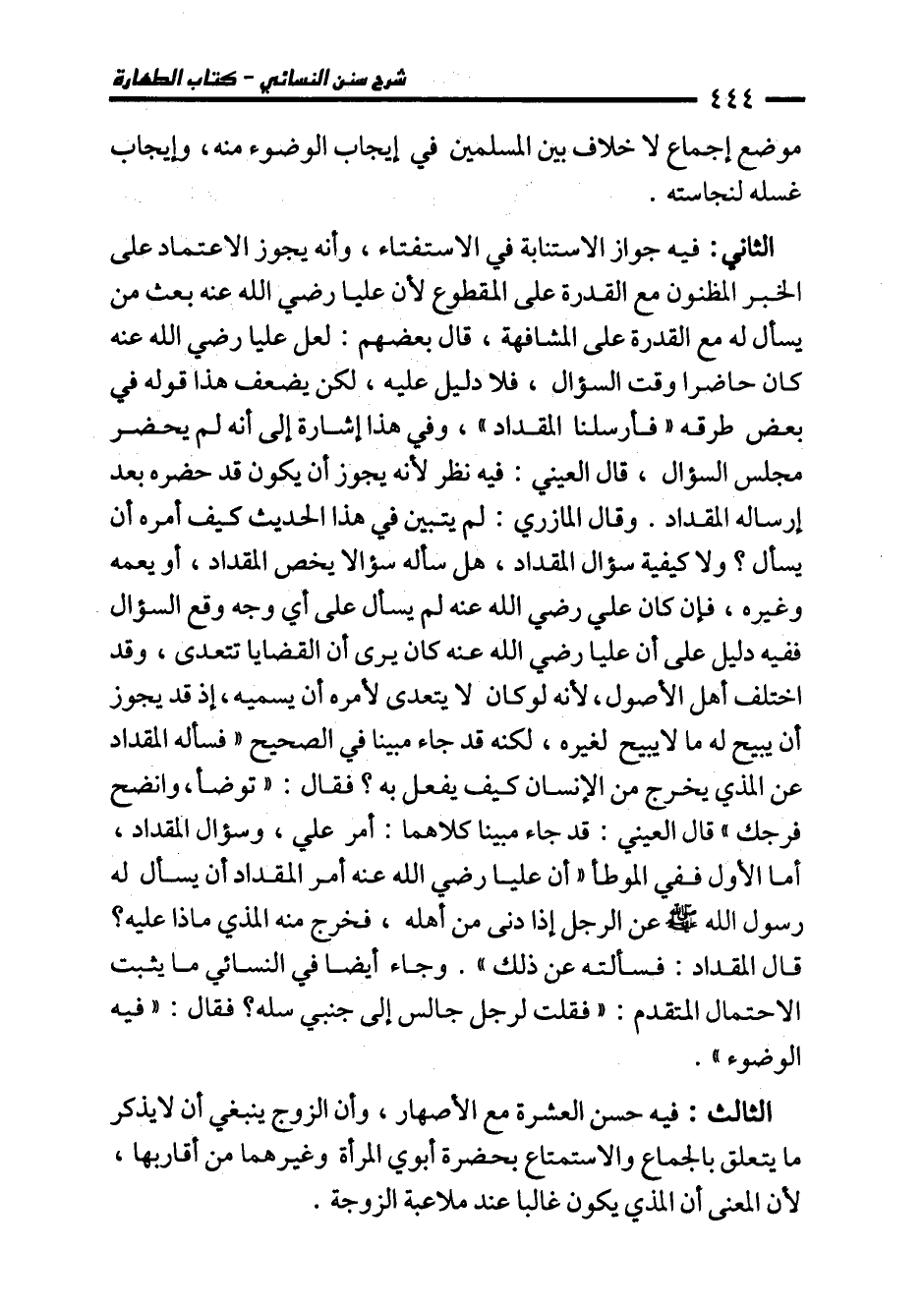 الثاني: فيه جواز الاستنابة في الاستفتاء، وأنه يجوز الاعتماد على الخبر المظنون مع القدرة على المقطوع لأن عليا رضي الله عنه بعث من يسأل له مع القدرة على المشافهة، قال بعضهم: لعل عليا رضي الله عنه كان حاضرا وقت السؤال، فلا دليل عليه، لكن يضعف هذا قوله في بعض طرقه "فأرسلنا المقداد"، وفي هذا إشارة إلى أنه لم يحضر مجلس السؤال، قال العيني: فيه نظر لأنه يجوز أن يكون قد حضره بعد إرساله المقداد. وقال المازري: لم يتبين في هذا الحديث كيف أمره أن يسأل؟ ولا كيفية سؤال المقداد، هل سأله سؤالا يخص المقداد، أو يعمه وغيره، فإن كان علي رضي الله عنه لم يسأل على أي وجه وقع السؤال ففيه دليل على أن عليا رضي الله عنه كان يرى أن القضايا تتعدى، وقد