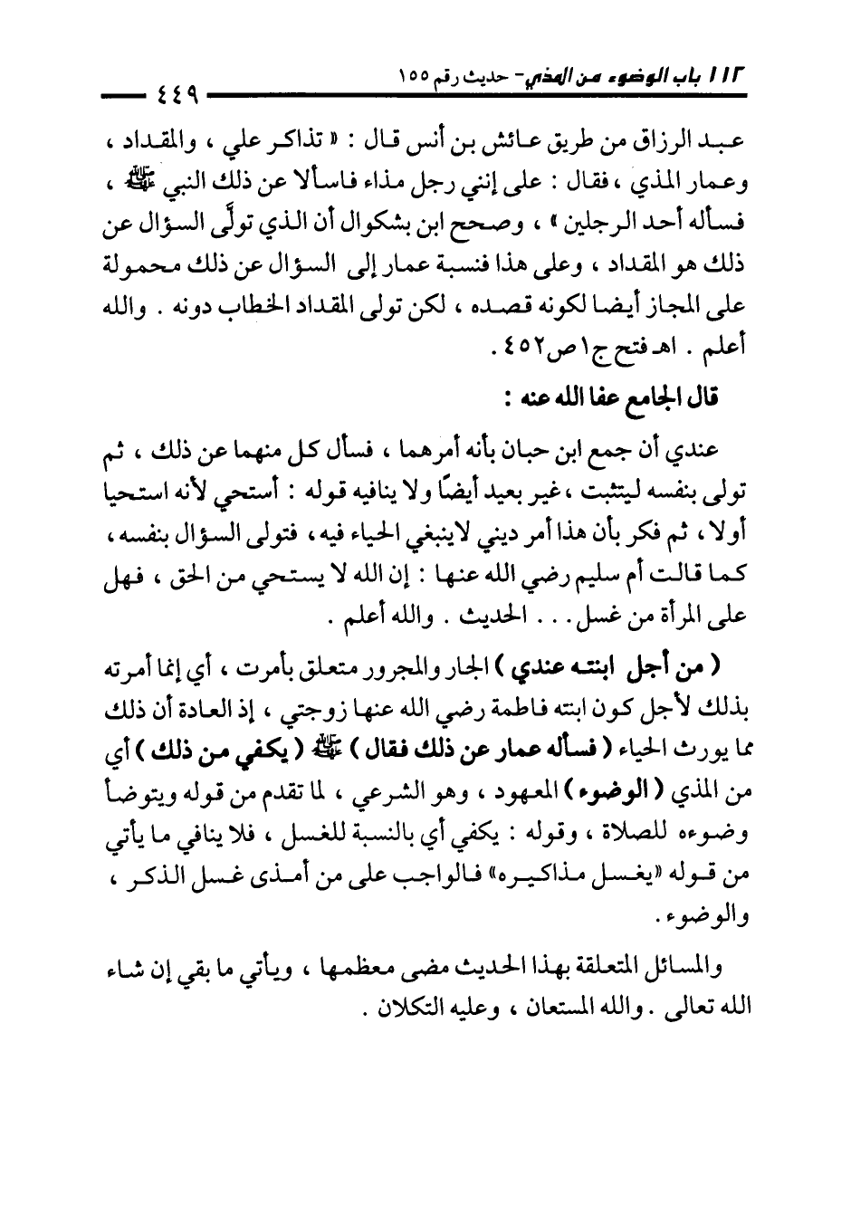 عبد الرزاق من طريق عائش بن أنس قال: "تذاكر علي، والمقداد، وعمار المذي، فقال: على إنني رجل مذاء فاسألا عن ذلك النبي - صلى الله عليه وسلم -، فسأله أحد الرجدين"، وصحح ابن بشكوال أن الذي تولىَّ السؤال عن ذلك هو المقداد، وعلى هذا فنسبة عمار إلى السؤال عن ذلك محمولة على المجاز أيضا لكونه قصده، لكن تولى المقداد الخطاب دونه. والله أعلم. اهـ فتح ج 1 ص 452.
