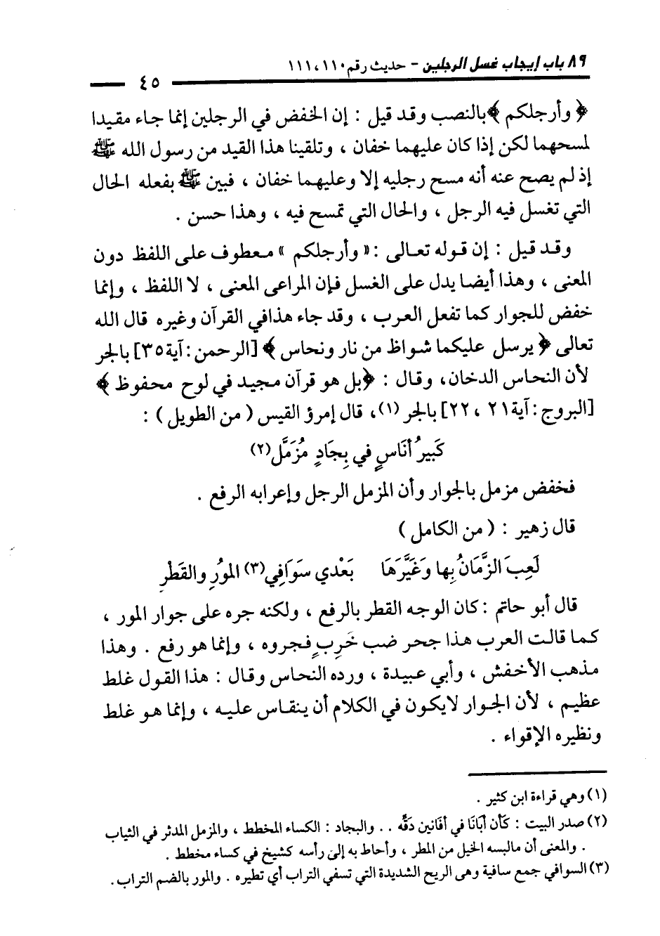 وقد قيل: إن قوله تعالى: "وأرجلكم" معطوف على اللفظ دون المعنى، وهذا أيضا يدل على الغسل فإن المراعى المعنى، لا اللفظ، وإنما خفض للجوار كما تفعل العرب، وقد جاء هذا في القرآن وغيره قال الله تعالى {يُرْسَلُ عَلَيْكُمَا شُوَاظٌ مِنْ نَارٍ وَنُحَاسٌ} [الرحمن: آية 35]، بالجر لأن النحاس الدخان، وقال: {بَلْ هُوَ قُرْآنٌ مَجِيدٌ (21) فِي لَوْحٍ مَحْفُوظٍ (22)} [البروج: آية 21، 22] [البروج: آية 21، 22] بالجر (¬1)، قال إمرؤ القيس (من الطويل):