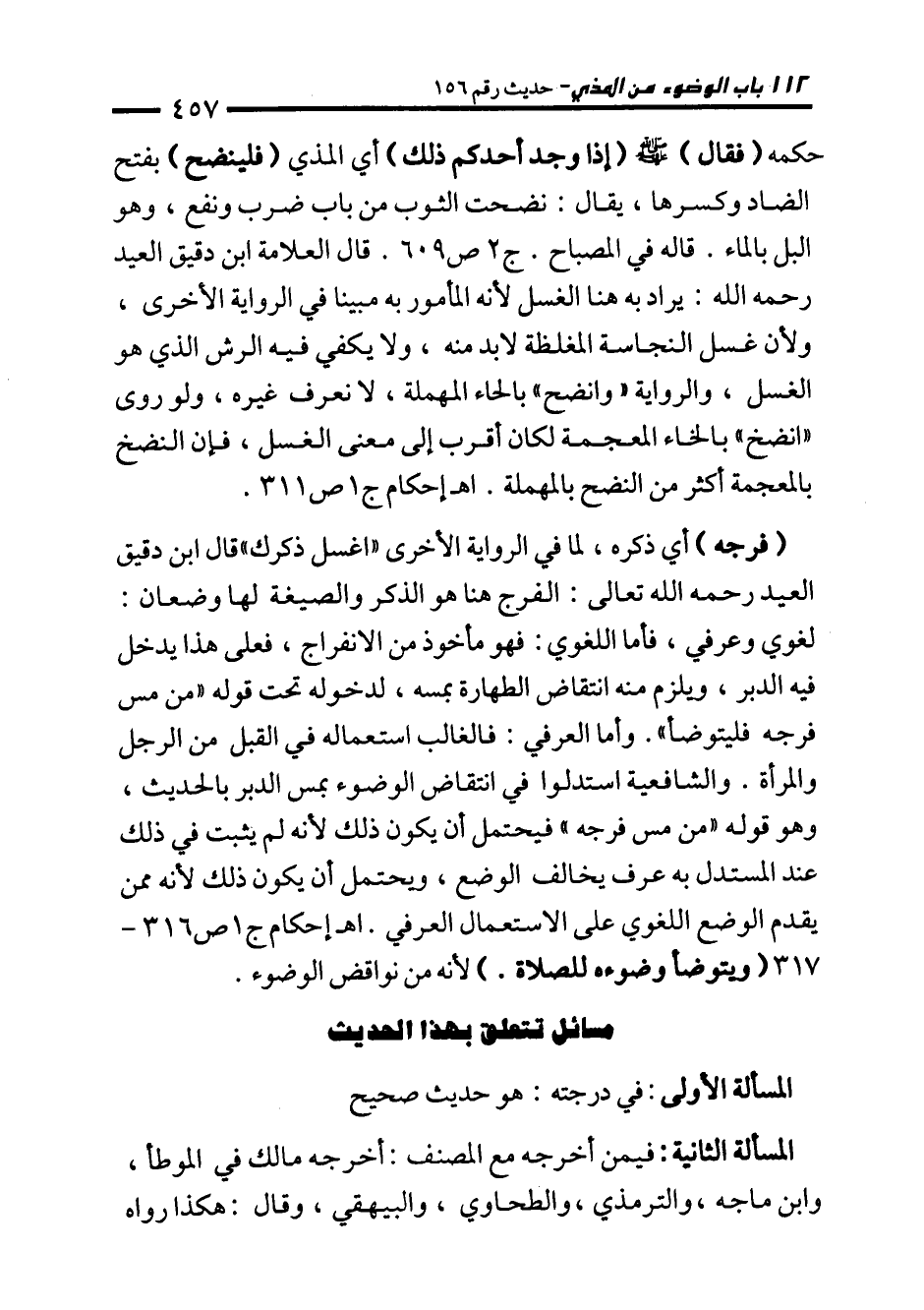 حكمه (فقال) - صلى الله عليه وسلم - (إذا وجد أحدكم ذلك) أي المذي (فلينضح) بفتح الضاد وكسرها، يقال: نضحت الثوب من باب ضرب ونفع، وهو البل بالماء. قاله في المصباح. ج 2 ص 609. قال العلامة ابن دقيق العيد رحمه الله: يراد به هنا الغسل لأنه المأمور به مبينا في الرواية الأخرى، ولأن غسل النجاسة المغلظة لابد منه، ولا يكفي فيه الرش الذي هو الغسل، والرواية "وانضح" بالحاء المهملة، لا نعرف غيره، ولو روى "انضخ" بالخاء المعجمة لكان أقرب إلى معنى الغسل، فإن النضخ بالمعجمة أكثر من النضح بالمهملة. اهـ إحكام ج 1 ص 311.