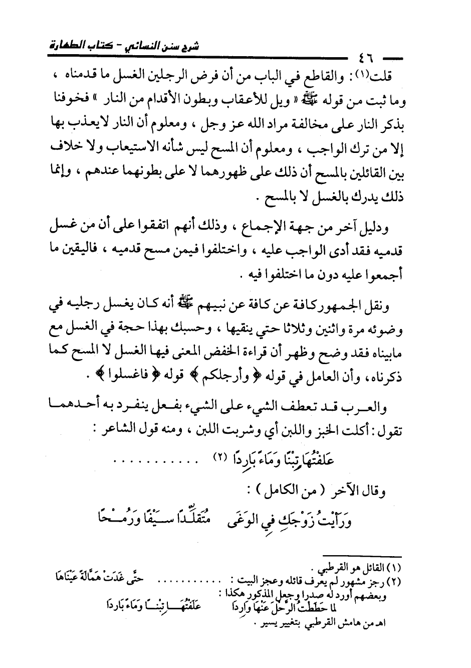 قلت (¬1): والقاطع في الباب من أن فرض الرجلين الغسل ما قدمناه، وما ثبت من قوله - صلى الله عليه وسلم - "ويل للأعقاب وبطون الأقدام من النار" فخوفنا بذكر النار على مخالفة مراد الله عز وجل، ومعلوم أن النار لا يعذب بها إلا من ترك الواجب، ومعلوم أن المسح ليس شأنه الاستيعاب ولا خلاف بين القائلين بالمسح أن ذلك على ظهورهما لا على بطونهما عندهم، وإنما ذلك يدرك بالغسل لا بالمسح.