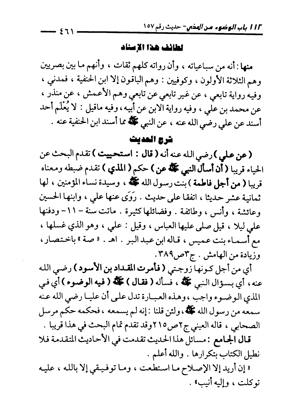 (عن علي) رضي الله عنه أنه (قال: استحييت) تقدم البحث عن الحياء قريبا (أن أسأل النبي - صلى الله عليه وسلم - عن) حكم (المذي) تقدم ضبطه ومعناه قريبا (من أجل فاطمة) بنت رسول الله - صلى الله عليه وسلم -، وسيدة نساء المؤمنين، لها ثمانية عشر حديثا، اتفقا على حديث. رَوَى عنها علي، وابنها الحسين وعائشة، وأنس، وطائفة. وفضائلها كثيرة. ماتت سنة -11 - ودفنها علي ليلا، قيل صلى عليها العباس، وقيل: علي، وهو الذي غسلها، مع أسماء بنت عميس، قاله ابن عبد البر. اهـ. "صة" باختصار، وزيادة من الهامش. ج 3 ص 389.