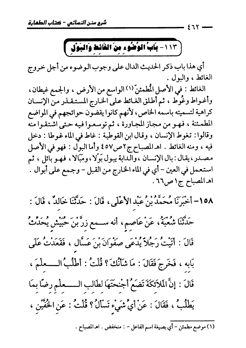 158 - أَخْبَرَنَا مُحَمَّدُ بْنُ عَبْدِ الأَعْلَى، قَالَ: حَدَّثَنَا خَالِدٌ، حَدَّثَنَا شُعْبَةُ، عَنْ عَاصِمٍ، أَنَّهُ سَمِعَ زِرَّ بْنَ حُبَيْشٍ يُحَدِّثُ قَالَ: أَتَيْتُ رَجُلاً يُدْعَى صَفْوَانَ بْنَ عَسَّالٍ، فَقَعَدْتُ عَلَى بَابِهِ، فَخَرَجَ فَقَالَ: مَا شَأْنُكَ؟ قُلْتُ: أَطْلُبُ الْعِلْمَ، قَالَ: إِنَّ الْمَلاَئِكَةَ تَضَعُ أَجْنِحَتَهَا لِطَالِبِ الْعِلْمِ رِضًا بِمَا يَطْلُبُ، فَقَالَ: عَنْ أَيِّ شَيْءٍ تَسْأَلُ؟ قُلْتُ: عَنِ الْخُفَّيْنِ،
