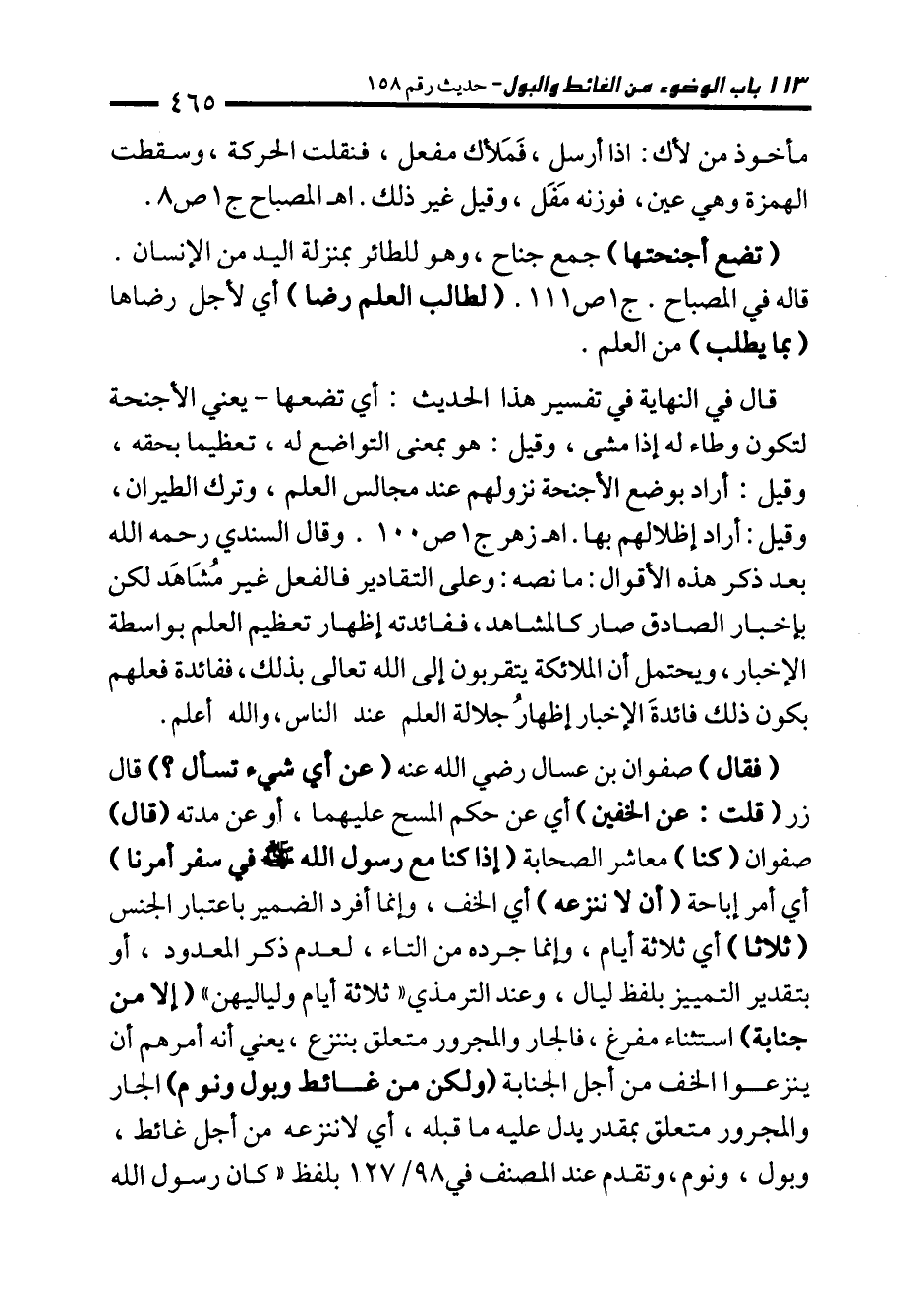 (فقال) صفوان بن عسال رضي الله عنه (عن أي شيء تسأل؟) قال زر (قلت: عن الخفين) أي عن حكم المسح عليهما، أو عن مدته (قال) صفوان (كنا) معاشر الصحابة (إذا كنا مع رسول الله - صلى الله عليه وسلم - في سفر أمرنا) أي أمر إباحة (أن لا ننزعه) أي الخف، وإنما أفرد الضمير باعتبار الجنس (ثلاثا) أي ثلاثة أيام، وإنما جرده من التاء، لعدم ذكر المعدود، أو بتقدير التمييز بلفظ ليال، وعند الترمذي "ثلاثة أيام ولياليهن" (إلا من جنابة) استثناء مفرغ، فالجار والمجرور متعلق بننزع، يعني أنه أمرهم أن ينزعوا الخف من أجل الجنابة (ولكن من غائط وبول ونوم) الجار والمجرور متعلق بمقدر يدل عليه ما قبله، أي لا ننزعه من أجل غائط، وبول، ونوم، وتقدم عند المصنف في 98/ 127 بلفظ "كان رسول الله