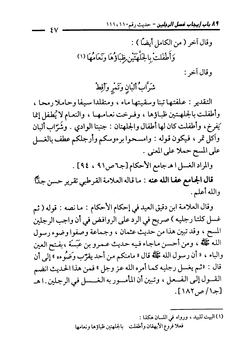 وقال العلامة ابن دقيق العيد في إحكام الأحكام: ما نصه: قوله (ثم غسل كلتا رجليه) صريح في الرد على الروافض في أن واجب الرجلين المسح، وقد تبين هذا من حديث عثمان، وجماعة وصفوا وضوء رسول الله - صلى الله عليه وسلم -، ومن أحسن ما جاء فيه حديث عمرو بن عَبَسَة، بفتح العين والباء، "أن رسول الله - صلى الله عليه وسلم - قال "ما منكم من أحد يقرب وَضُوءه" إلى أن قال: "ثم يغسل رجليه كما أمره الله عز وجل" فمن هذا الحديث انضم القول إلى الفعل، وتبين أن المأمور به الغسل في الرجلين. اهـ[جـ 1/ ص 182].