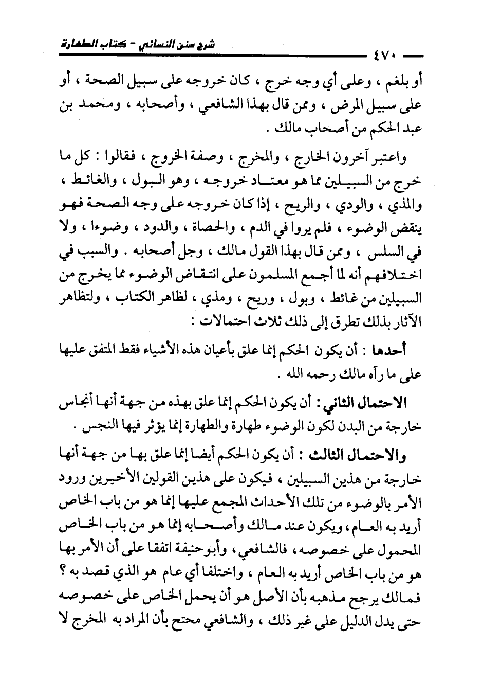 واعتبر آخرون الخارج، والمخرج، وصفة الخروج، فقالوا: كل ما خرج من السبيلين مما هو معتاد خروجه، وهو البول، والغائط، والمذي، والودي، والريح، إذا كان خروجه على وجه الصحة فهو ينقض الوضوء، فلم يروا في الدم، والحصاة، والدود، وضوءا، ولا في السلس، وممن قال بهذا القول مالك، وجل أصحابه. والسبب في اختلافهم أنه لما أجمع المسلمون على انتقاض الوضوء مما يخرج من السبيلين من غائط، وبول، وريح، ومذي، لظاهر الكتاب، ولتظاهر الآثار بذلك تطرق إلى ذلك ثلاث احتمالات: