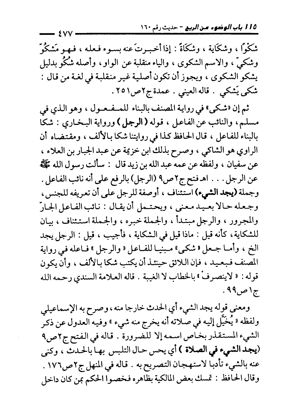 ثم إن "شكى" في رواية المصنف بالبناء للمفعول، وهو الذي في مسلم، والنائب عن الفاعل، قوله (الرجل) ورواية البخاري: شكا بالبناء للفاعل، قال الحافظ كذا في روايتنا شكا بالألف، ومقتضاه أن الراوي هو الشاكي، وصرح بذلك ابن خزيمة عن عبد الجبار بن العلاء، عن سفيان، ولفظه عن عمه عبد الله بن زيد قال: سألت رسول الله - صلى الله عليه وسلم - عن الرجل ... اهـ فتح ج 2 ص 9 (الرجل) بالرفع على أنه نائب الفاعل. وجملة (يجد الشيء) استئناف، أو صفة للرجل على أن تعريفه للجنس، وجعله حالا بعيد معنى، ويحتمل أن يقال: نائب الفاعل الجارّ والمجرور، والرجل مبتدأ، والجملة خبره، والجملة استئناف، بيان للشكاية، كأنه قيل: ماذا قيل في الشكاية، فأجيب، قيل: الرجل يجد الخ، وأما جعل "شكى" مبنيا للفاعل "والرجل" فاعله في رواية المصنف فبعيد، فإن اللائق حينئذ أن يكتب شكا بالألف، وأن يكون قوله: "لا ينصرف" بالخطاب لا الغيبة. قاله العلامة السندي رحمه الله ج 1 ص 99.