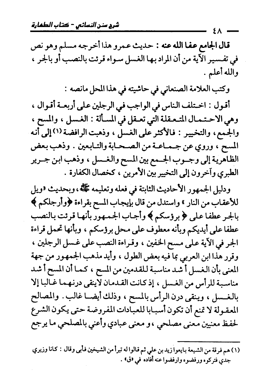 قال الجامع عفا الله عنه: حديث عمرو هذا أخرجه مسلم وهو نص في تفسير الآية من أن المراد بها الغسل سواء قرئت بالنصب أو بالجر، والله أعلم.