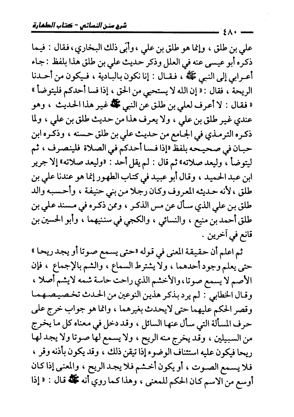 علي بن طلق، وإنما هو طلق بن علي، وأبَى ذلك البخاري، فقال: فيما ذكره أبو عيسى عنه في العلل وذكر حديث علي بن طلق هذا بلفظ: جاء أعرابي إلى النبي - صلى الله عليه وسلم -، فقال: إنا نكون بالبادية، فيكون من أحدنا الريحة، فقال: "إن الله لا يستحيى من الحق، إذا فسا أحدكم فليتوضأ" "فقال: لا أعرف لعلي بن طلق عن النبي - صلى الله عليه وسلم - غير هذا الحديث، وهو عندي غير طلق بن علي، ولا يعرف هذا من حديث طلق بن علي، ولما ذكره الترمذي في الجامع من حديث علي بن طلق حسنه، وذكره ابن حبان في صحيحه بلفظ "إذا فسا أحدكم في الصلاة فلينصرف، ثم ليتوضأ، وليعد صلاته" ثم قال: لم يقل أحد: "وليعد صلاته" إلا جرير ابن عبد الحميد، وقال أبو عبيد في كتاب الطهور إنما هو عندنا علي بن طلق؛ لأنه حديثه المعروف وكان رجلا من بني حنيفة، وأحسبه والد طلق بن علي الذي سأل عن مس الذكر، وممن ذكره في مسند علي بن طلق أحمد بن منيع، والنسائي، والكجي في سننيهما، وأبو الحسين بن قانع في آخرين.