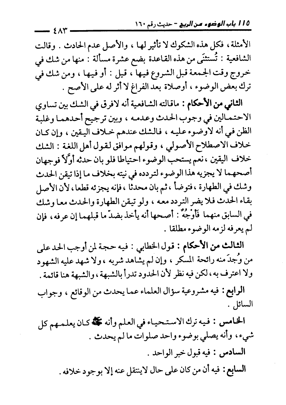 الثاني من الأحكام: ما قالته الشافعية أنه لا فرق في الشك بين تساوي الاحتمالين في وجوب الحدث وعدمه، وبين ترجيح أحدهما وغلبة الظن في أنه لا وضوء عليه، فالشك عندهم خلاف اليقين، وإن كان خلاف الاصطلاح الأصولي، وقولهم موافق لقول أهل اللغة: الشك خلاف اليقين، نعم يستحب الوضوء احتياطا فلو بان حدثه أوَّلًا فوجهان أصحهما لا يجزيه هذا الوضوء لتردده في نيته بخلاف ما إذا تيقن الحدث وشك في الطهارة، فتوضأ، ثم بان محدثا، فإنه يجزئه قطعا؛ لأن الأصل بقاء الحدث فلا يضر التردد معه، ولو تيقن الطهارة والحدث معا وشك في السابق منهما فَأوْجُهٌ: أصحها أنه يأخذ بضدّ ما قبلهما إن عرفه، فإن لم يعرفه لزمه الوضوء مطلقا.