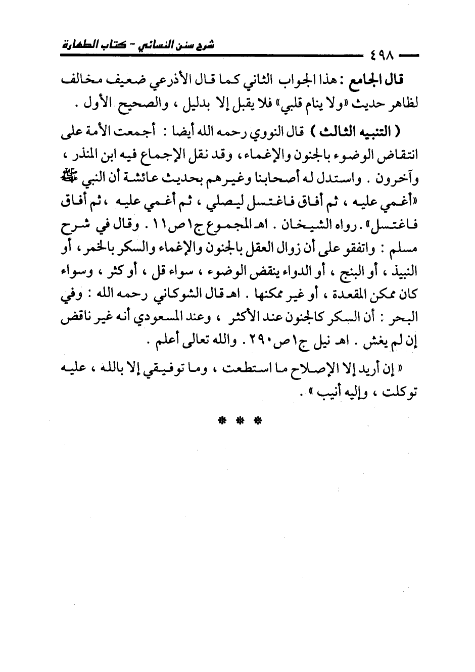 (التنبيه الثالث) قال النووي رحمه الله أيضا: أجمعت الأمة على انتقاض الوضوء بالجنون والإغماء، وقد نقل الإجماع فيه ابن المنذر، وآخرون. واستدل له أصحابنا وغيرهم بحديث عائشة أن النبي - صلى الله عليه وسلم - "أغمي عليه، ثم أفاق فاغتسل ليصلي، ثم أغمي عليه، ثم أفاق فاغتسل". رواه الشيخان. اهـ المجموع ج 1 ص 11. وقال في شرح مسلم: واتفقو على أن زوال العقل بالجنون والإغماء والسكر بالخمر، أو النبيذ، أو البنج، أو الدواء ينقض الوضوء، سواء قل، أو كثر، وسواء كان ممكن المقعدة، أو غير ممكنها. اهـ قال الشوكاني رحمه الله: وفي البحر: أن السكر كالجنون عند الأكثر، وعند المسعودي أنه غير ناقض إن لم يغش. اهـ نيل ج 1 ص 290. والله تعالى أعلم.