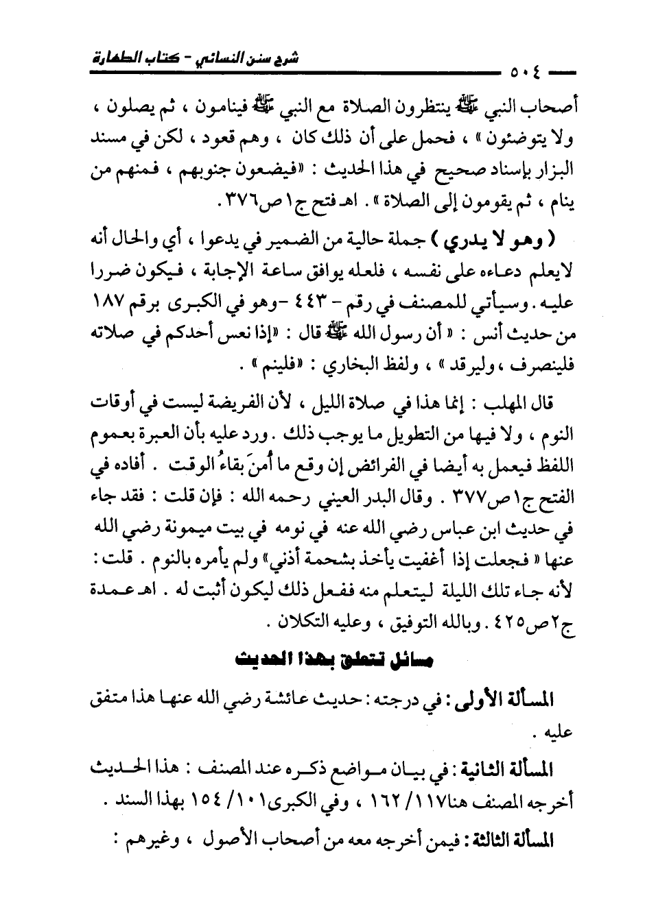 أصحاب النبي - صلى الله عليه وسلم - ينتظرون الصلاة مع النبي - صلى الله عليه وسلم - فينامون، ثم يصلون، ولا يتوضئون"، فحمل على أن ذلك كان، وهم قعود، لكن في مسند البزار بإسناد صحيح في هذا الحديث: "فيضعون جنوبهم، فمنهم من ينام، ثم يقومون إلى الصلاة". اهـ فتح ج 1 ص 376.