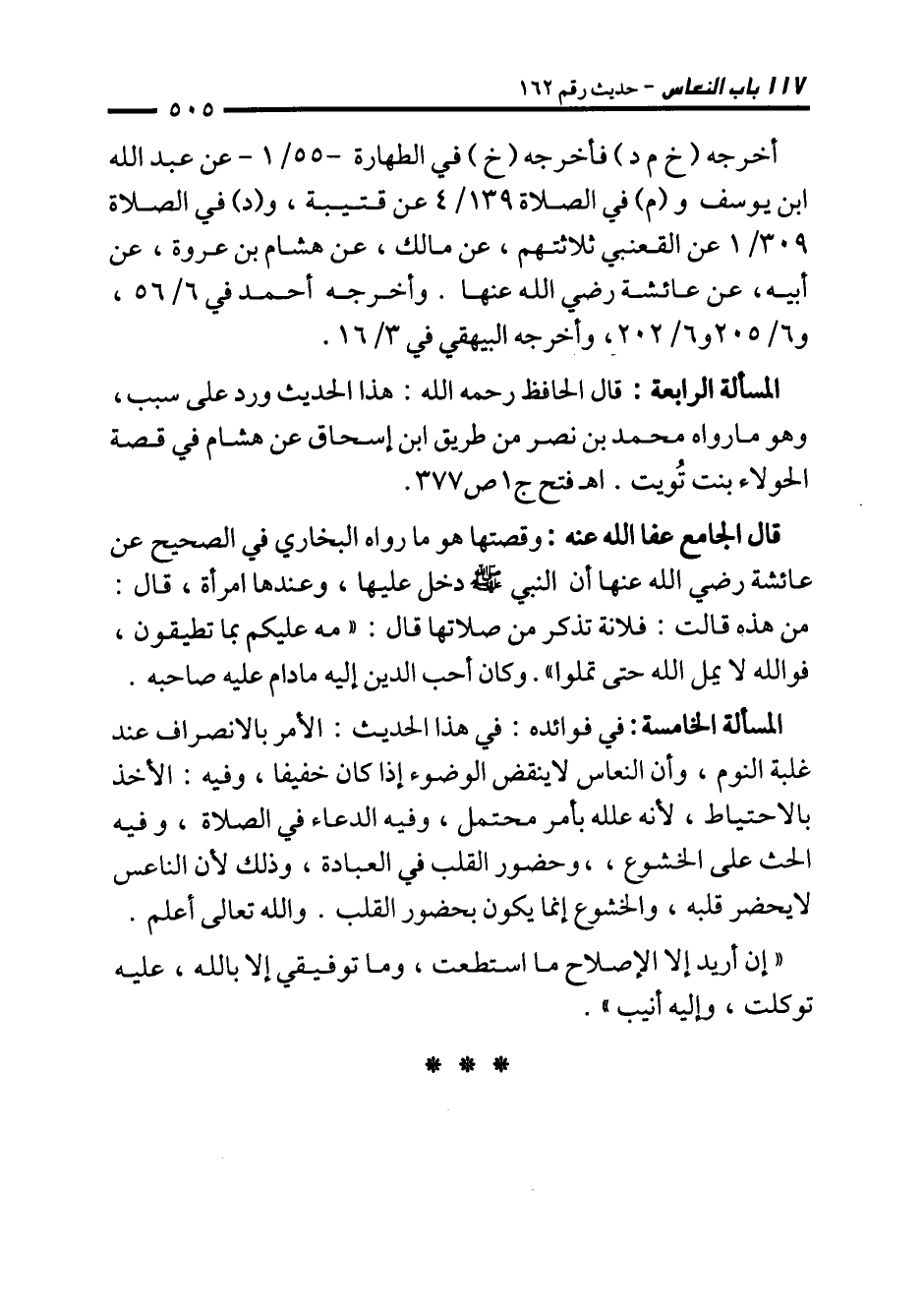 قال الجامع عفا الله عنه: وقصتها هو ما رواه البخاري في الصحيح عن عائشة رضي الله عنها أن النبي - صلى الله عليه وسلم - دخل عليها، وعندها امرأة، قال: من هذه قالت: فلانة تذكر من صلاتها قال: "مه عليكم بما تطيقون، فوالله لا يمل الله حتى تملوا". وكان أحب الدين إليه ما دام عليه صاحبه. المسألة الخامسة: في فوائده: في هذا الحديث: الأمر بالانصراف عند غلبة النوم، وأن النعاس لا ينقض الوضوء إذا كان خفيفا، وفيه: الأخذ بالاحتياط؛ لأنه علله بأمر محتمل، وفيه الدعاء في الصلاة، وفيه الحث على الخشوع، وحضور القلب في العبادة، وذلك لأن الناعس لا يحضر قلبه، والخشوع إنما يكون بحضور القلب. والله تعالى أعلم.