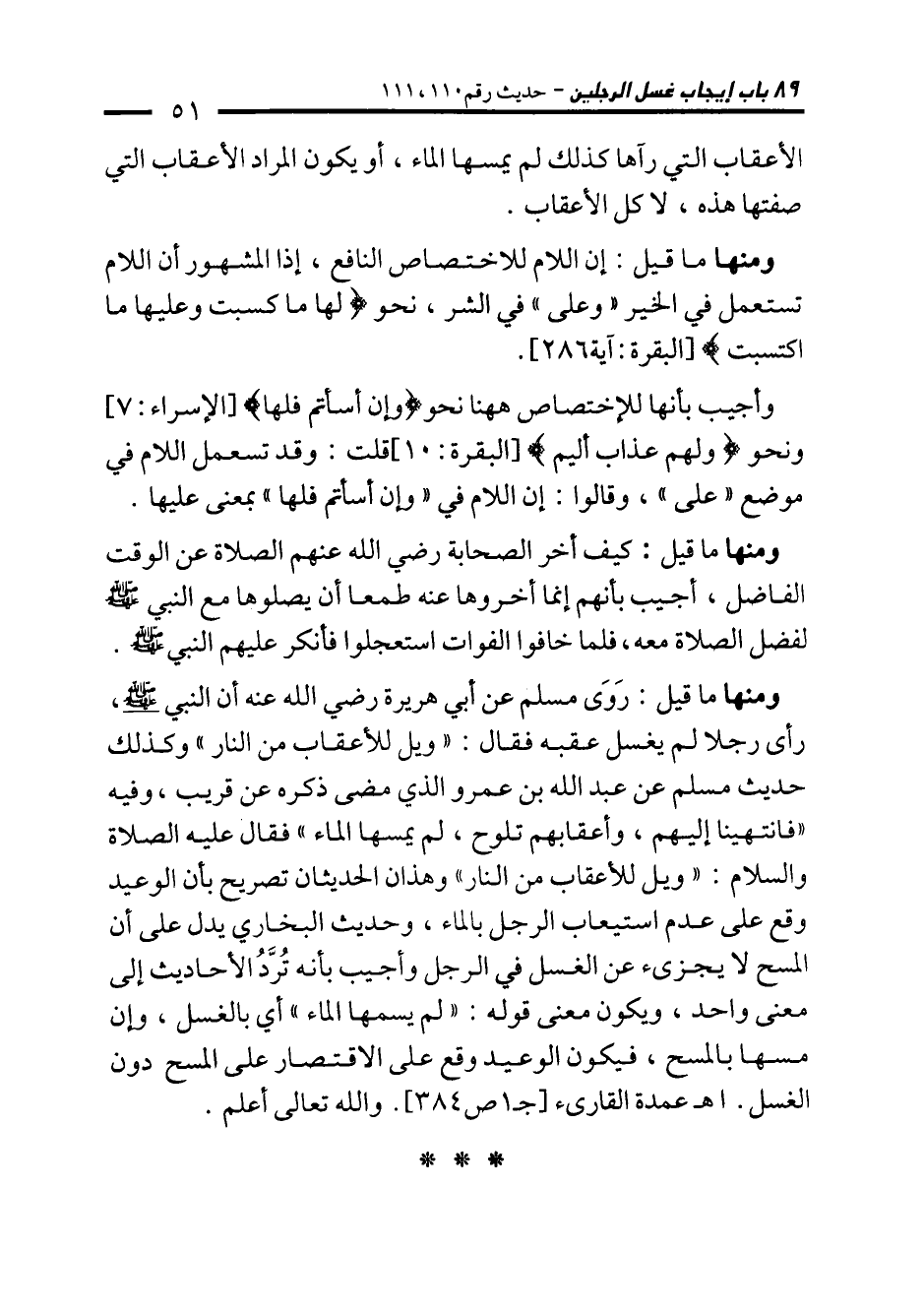 ومنها ما قيل: رَوَى مسلم عن أبي هريرة رضي الله عنه أن النبي - صلى الله عليه وسلم -، رأى رجلا لم يغسل عقبه فقال: "ويل للأعقاب من النار" وكذلك حديث مسلم عن عبد الله بن عمرو الذي مضى ذكره عن قريب، وفيه "فانتهينا إليهم، وأعقابهم تلوح، لم يمسها الماء" فقال عليه الصلاة والسلام: "ويل للأعقاب من النار" وهذان الحديثان تصريح بأن الوعيد وقع على عدم استيعاب الرجل بالماء، وحديث البخاري يدل على أن المسح لا يجزئ عن الغسل في الرجل وأجيب بأنه تُرَّدُ الأحاديث إلى معنى واحد، ويكون معنى قوله: "لم يسمها الماء" أي بالغسل، وإن مسها بالمسح، فيكون الوعيد وقع على الاقتصار على المسح دون الغسل. اهـ عمدة القارئ [جـ 1 ص 384]. والله تعالى أعلم.