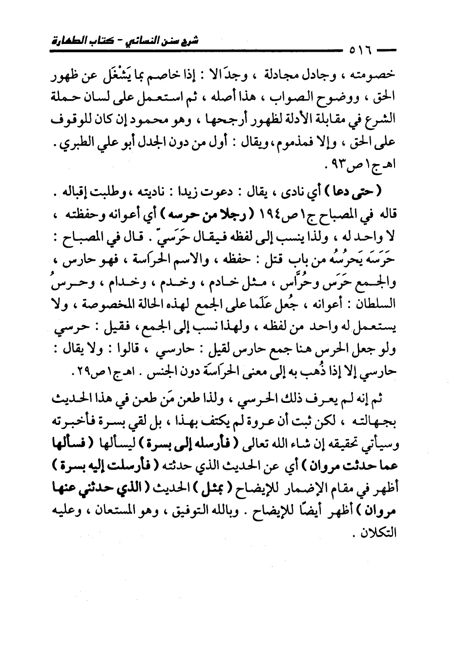 (حتى دعا) أي نادى، يقال: دعوت زيدا: ناديته، وطلبت إقباله. قاله في المصباح ج 1 ص 194 (رجلا من حرسه) أي أعوانه وحفظته، لا واحد له، ولذا ينسب إلى لفظه فيقال حَرَسيّ. قال في المصباح: حَرَسَه يَحرُسُه من باب قتل: حفظه، والاسم الحرَاسة، فهو حارس، والجمع حَرَس وحُرَّاس، مثل خادم، وخدم، وخدام، وحرسُ السلطان: أعوانه، جُعل عَلَما على الجمع لهذه الحالة المخصوصة، ولا يستعمل له واحد من لفظه، ولهذا نسب إلى الجمع، فقيل: حرسي ولو جعل الحرس هنا جمع حارس لقيل: حارسي، قالوا: ولا يقال: حارسي إلا إذا ذُهب به إلى معنى الحرَاسَة دون الجنس. اهـ ج 1 ص 29.