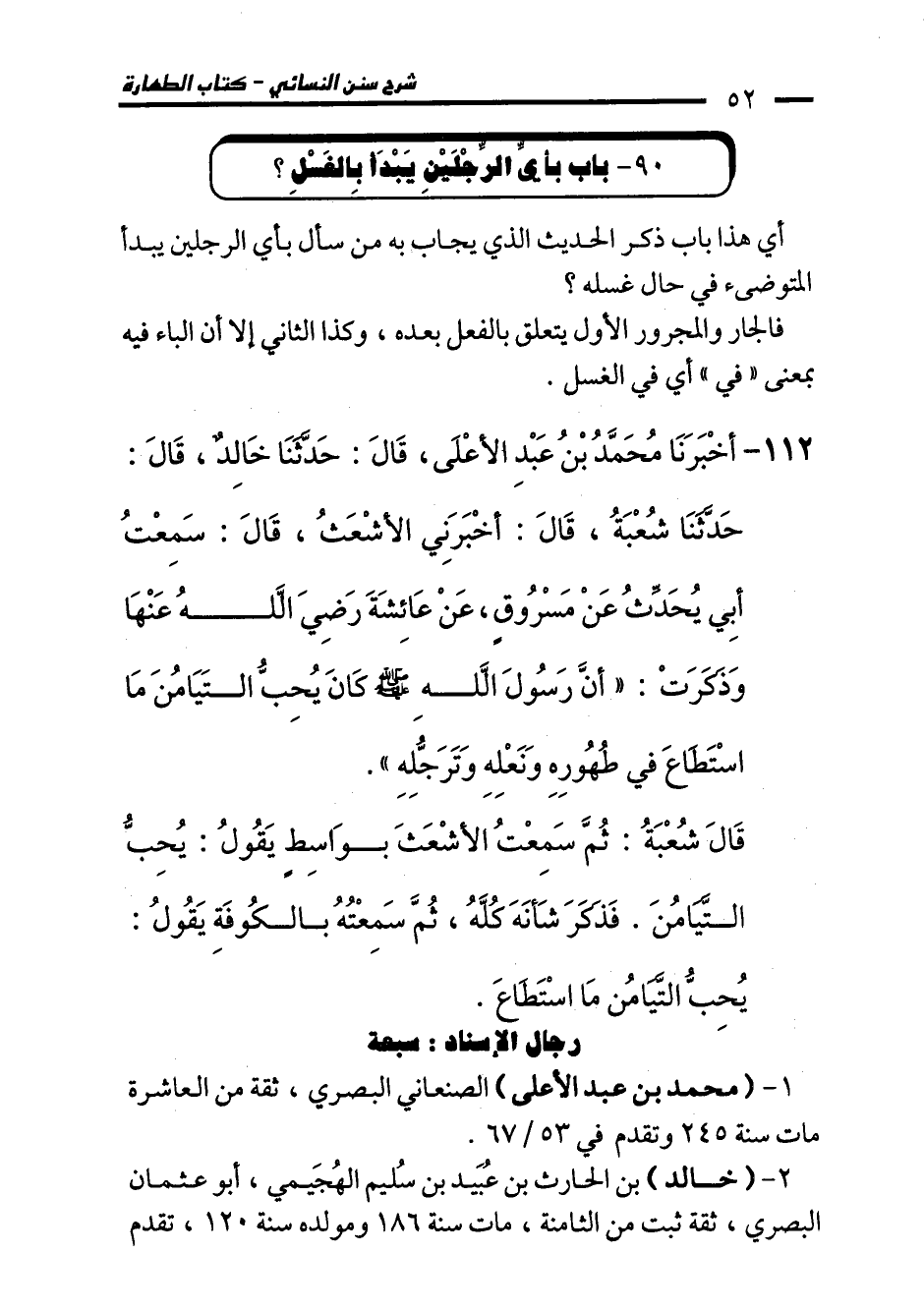 112 - أَخْبَرَنَا مُحَمَّدُ بْنُ عَبْدِ الأَعْلَى، قَالَ: حَدَّثَنَا خَالِدٌ، قَالَ: حَدَّثَنَا شُعْبَةُ، قَالَ: أَخْبَرَنِي الأَشْعَثُ، قَالَ: سَمِعْتُ أَبِي يُحَدِّثُ عَنْ مَسْرُوقٍ، عَنْ عَائِشَةَ رَضِيَ اللهُ عَنْهَا وَذَكَرَتْ: "أَنَّ رَسُولَ اللهِ - صلى الله عليه وسلم - كَانَ يُحِبُّ التَّيَامُنَ مَا اسْتَطَاعَ فِي طُهُورِهِ وَنَعْلِهِ وَتَرَجُّلِهِ".