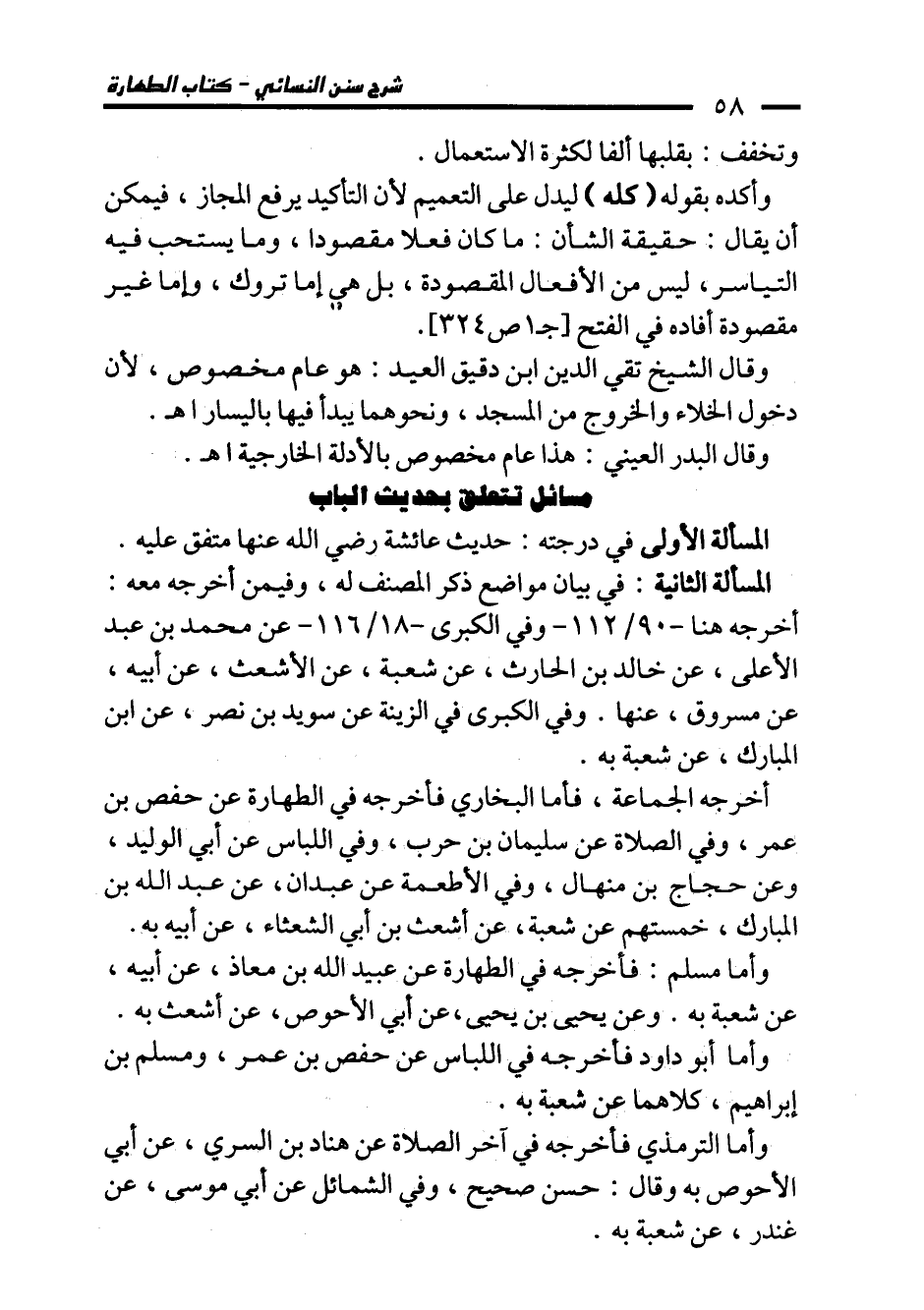المسألة الثانية: في بيان مواضع ذكر المصنف له، وفيمن أخرجه معه: أخرجه هنا -90/ 112 - وفي الكبرى -18/ 116 - عن محمَّد بن عبد الأعلى، عن خالد بن الحارث، عن شعبة، عن الأشعث، عن أبيه، عن مسروق، عنها. وفي الكبرى في الزينة عن سويد بن نصر، عن ابن المبارك، عن شعبة به.