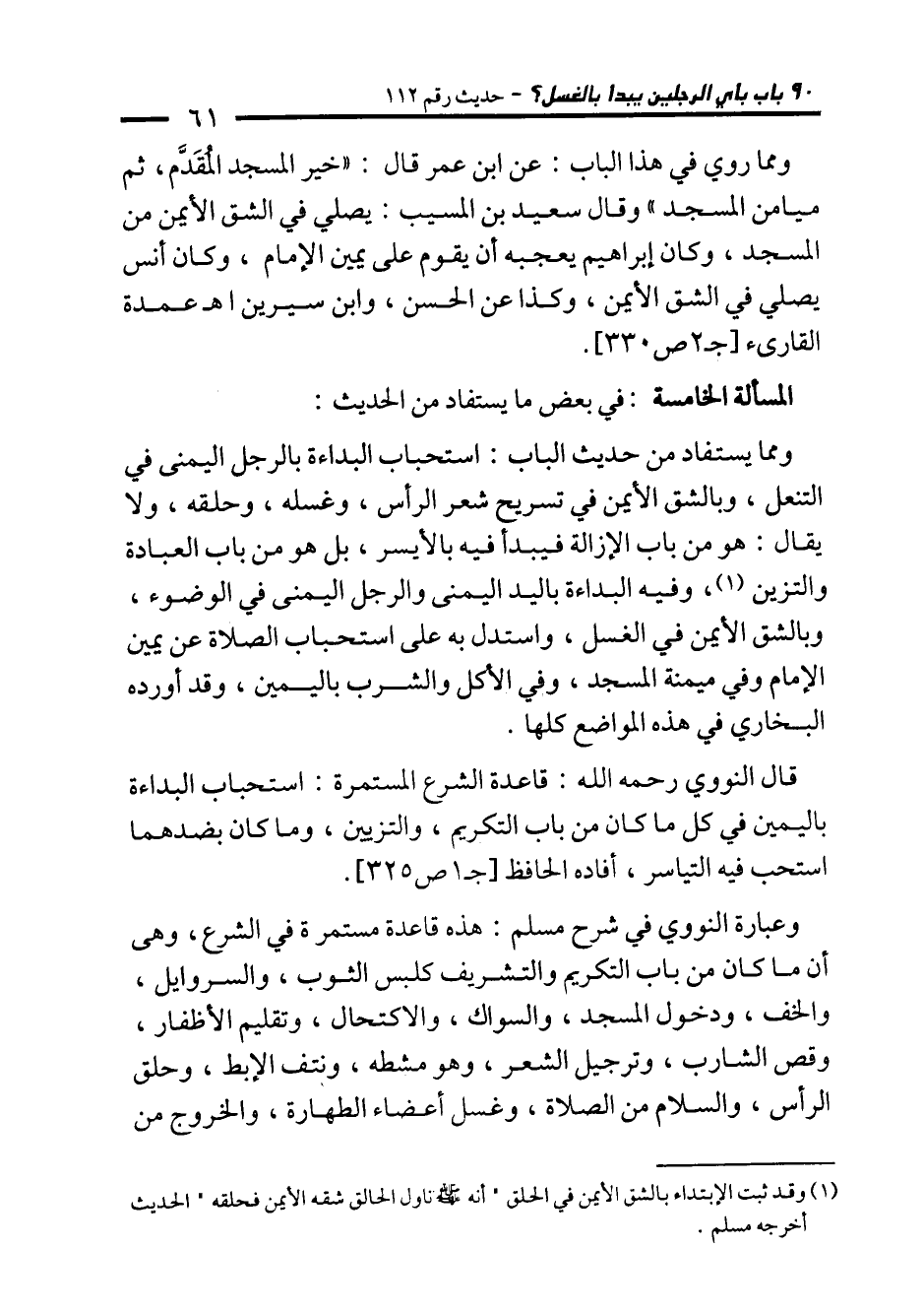 وعبارة النووي في شرح مسلم: هذه قاعدة مستمرة في الشرع، وهي أن ما كان من باب التكريم والتشريف كلبس الثوب، والسروايل، والخف، ودخول المسجد، والسواك، والاكتحال، وتقليم الأظفار، وقص الشارب، وترجيل الشعر، وهو مشطه، ونتف الإبط، وحلق الرأس، والسلام من الصلاة، وغسل أعضاء الطهارة، والخروج من