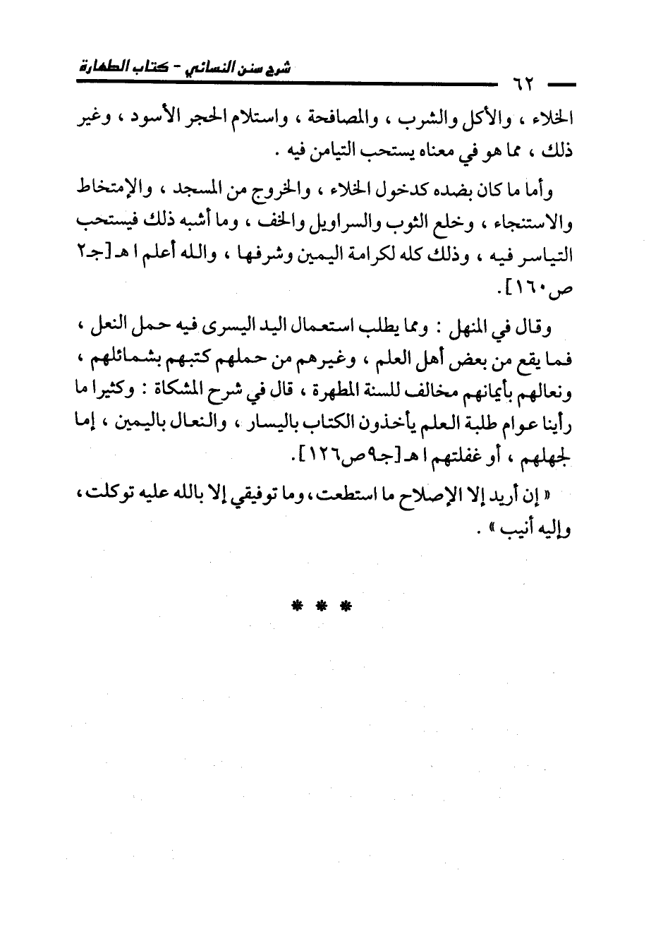 وقال في المنهل: ومما يطلب استعمال اليد اليسرى فيه حمل النعل، فما يقع من بعض أهل العلم، وغيرهم من حملهم كتبهم بشمائلهم، ونعالهم بأيمانهم مخالف للسنة المطهرة، قال في شرح المشكاة: وكثيرا ما رأينا عوام طلبة العلم يأخذون الكتاب باليسار، والنعال باليمين، إما لجهلهم، أو غفلتهم اهـ[ج 9 ص 126].