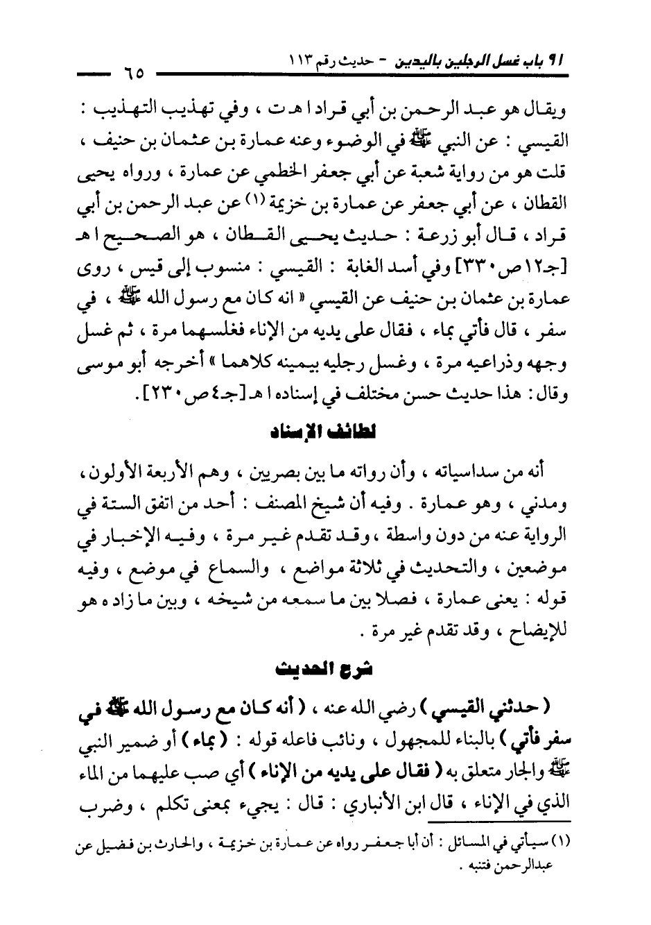 ويقال هو عبد الرحمن بن أبي قراد اهـ ت، وفي تهذيب التهذيب: القيسي: عن النبي - صلى الله عليه وسلم - في الوضوء وعنه عمارة بن عثمان بن حنيف، قلت هو من رواية شعبة عن أبي جعفر الخطمي عن عمارة، ورواه يحيى القطان، عن أبي جعفر عن عمارة بن خزيمة (¬1) عن عبد الرحمن بن أبي قراد، قال أبو زرعة: حديث يحيى القطان، هو الصحيح اهـ[جـ 12 ص 330] وفي أسد الغابة: القيسي: منسوب إلى قيس، روى عمارة بن عثمان بن حنيف عن القيسي "انه كان مع رسول الله - صلى الله عليه وسلم -، في سفر، قال فأتي بماء، فقال على يديه من الإناء فغلسهما مرة، ثم غسل وجهه وذراعيه مرة، وغسل رجليه بيمينه كلاهما" أخرجه أبو موسى وقال: هذا حديث حسن مختلف في إسناده اهـ[جـ 4 ص 230].