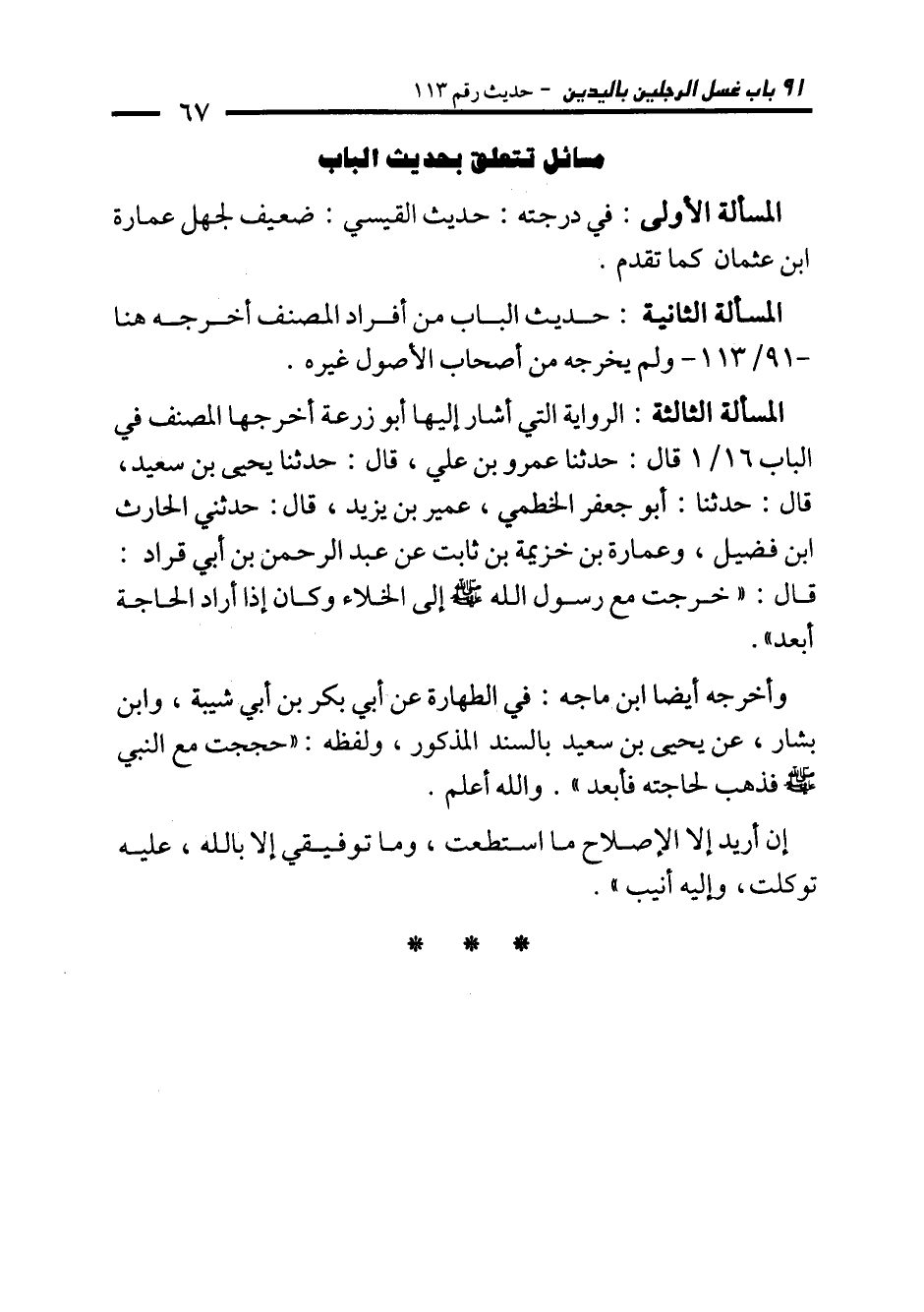 المسألة الثالثة: الرواية التي أشار إليها أبو زرعة أخرجها المصنف في الباب 16/ 1 قال: حدثنا عمرو بن علي، قال: حدثنا يحيى بن سعيد، قال: حدثنا: أبو جعفر الخطمي، عمير بن يزيد، قال: حدثني الحارث ابن فضيل، وعمارة بن خزيمة بن ثابت عن عبد الرحمن بن أبي قراد: قال: "خرجت مع رسول الله - صلى الله عليه وسلم - إلى الخلاء وكان إذا أراد الحاجة أبعد".