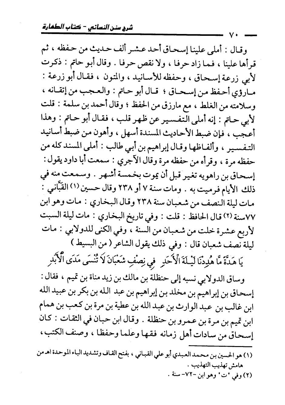 وقال: أملى علينا إسحاق أحد عشر ألف حديث من حفظه، ثم قرأها علينا، فما زاد حرفا، ولا نقص حرفا. وقال أبو حاتم: ذكرت لأبي زرعة إسحاق، وحفظه للأسانيد، والمتون، فقال أبو زرعة: ما رؤي أحفظ من إسحاق؛ قال أبو حاتم: والعجب من إتقانه، وسلامته من الغلط، مع ما رزق من الحفظ؛ وقال أحمد بن سلمة: قلت لأبي حاتم: إنه أملى التفسير عن ظهر قلب، فقال أبو حاتم: وهذا أعجب، فإن ضبط الأحاديث المسندة أسهل، وأهون من ضبط أسانيد التفسير، وألفاظها وقال إبراهيم بن أبي طالب: أملى المسند كله من حفظه مرة، وقرأه من حفظه مرة وقال الآجري: سمعت أبا داود يقول: إسحاق بن راهويه تغير قبل أن يموت بخمسة أشهر. وسمعت منه في ذلك الأيام فرميت به. ومات سنة 7 أو 238 وقال حسين (¬1) القَبَّاني: مات ليلة النصف من شعبان سنة 238 وقال البخاري: مات وهو ابن 77 سنة (¬2) قال الحافظ: قلت: وفي تاريخ البخاري: مات ليلة السبت لأربع عشرة خلت من شعبان من السنة، وفي الكنى للدولابي: مات ليلة نصف شعبان قال: وفي ذلك يقول الشاعر (من البسيط)