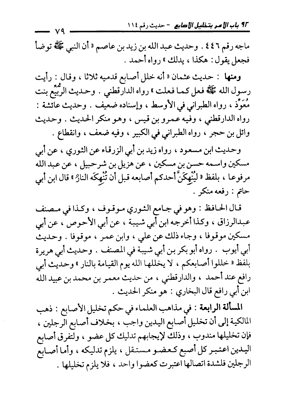ومنها: حديث عثمان "أنه خلل أصابع قدميه ثلاثًا، وقال: رأيت رسول الله - صلى الله عليه وسلم - فعل كما فعلت" رواه الدارقطني. وحديث الرُّبَيِّع بنت مُعَوِّذ، رواه الطبراني في الأوسط، وإسناده ضعيف. وحديث عائشة: رواه الدارقطني، وفيه عمرو بن قيس، وهو منكر الحديث. وحديث