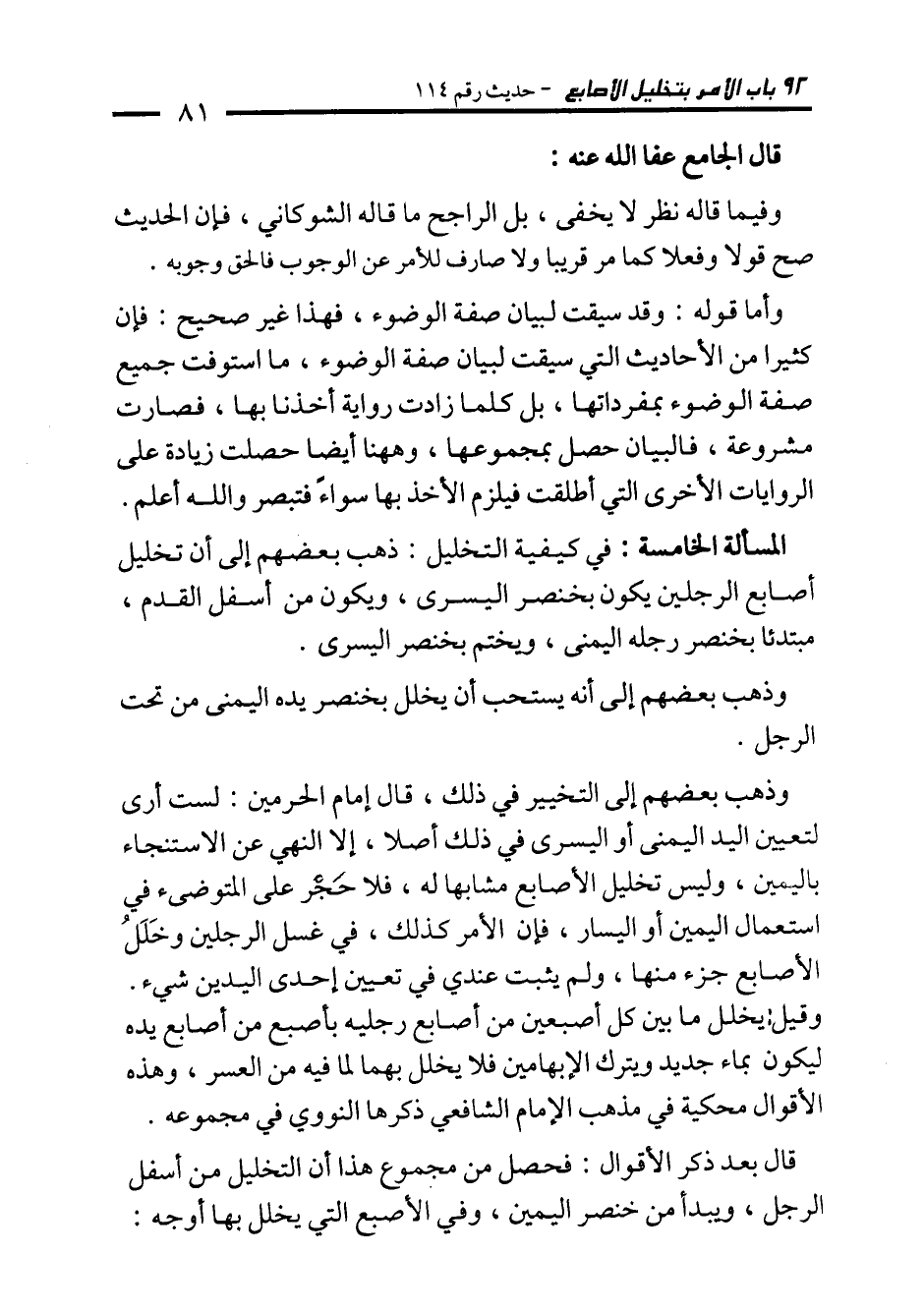 المسألة الخامسة: في كيفية التخليل: ذهب بعضهم إلى أن تخليل أصابع الرجلين يكون بخنصر اليسرى، ويكون من أسفل القدم، مبتدئا بخنصر رجله اليمنى، ويختم بخنصر اليسرى.