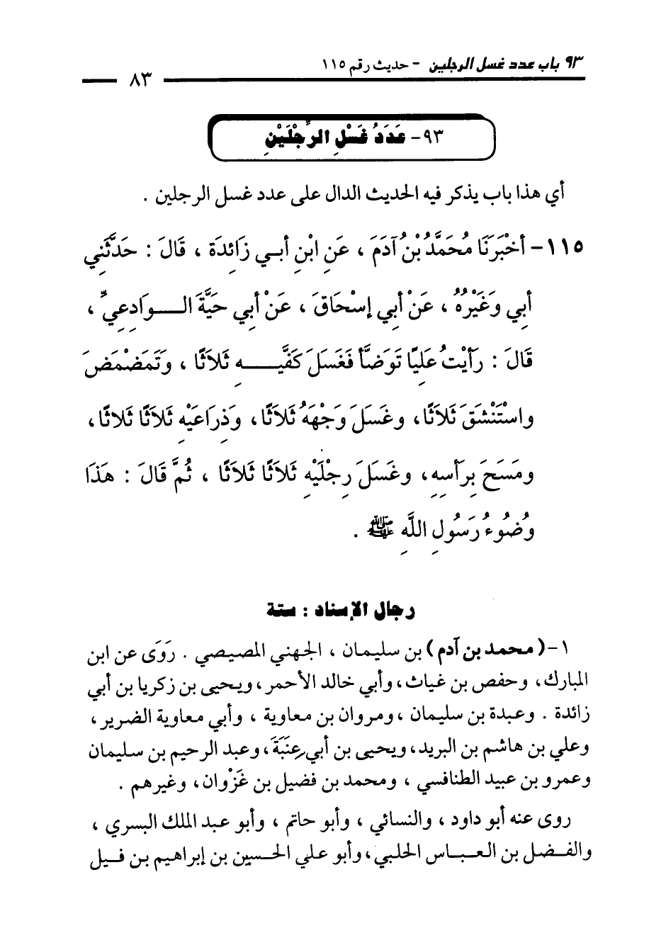 115 - أَخْبَرَنَا مُحَمَّدُ بْنُ آدَمَ، عَنِ ابْنِ أَبِي زَائِدَةَ، قَالَ: حَدَّثَنِي أَبِي وَغَيْرُهُ، عَنْ أَبِي إِسْحَاقَ، عَنْ أَبِي حَيَّةَ الْوَادِعِيِّ، قَالَ: رَأَيْتُ عَلِيًّا تَوَضَّأَ فَغَسَلَ كَفَّيْهِ ثَلاَثًا، وَتَمَضْمَضَ وَاسْتَنْشَقَ ثَلاَثًا، وَغَسَلَ وَجْهَهُ ثَلاَثًا، وَذِرَاعَيْهِ ثَلاَثًا ثَلاَثًا، وَمَسَحَ بِرَأْسِهِ، وَغَسَلَ رِجْلَيْهِ ثَلاَثًا ثَلاَثًا، ثُمَّ قَالَ: هَذَا وُضُوءُ رَسُولِ اللهِ - صلى الله عليه وسلم -.