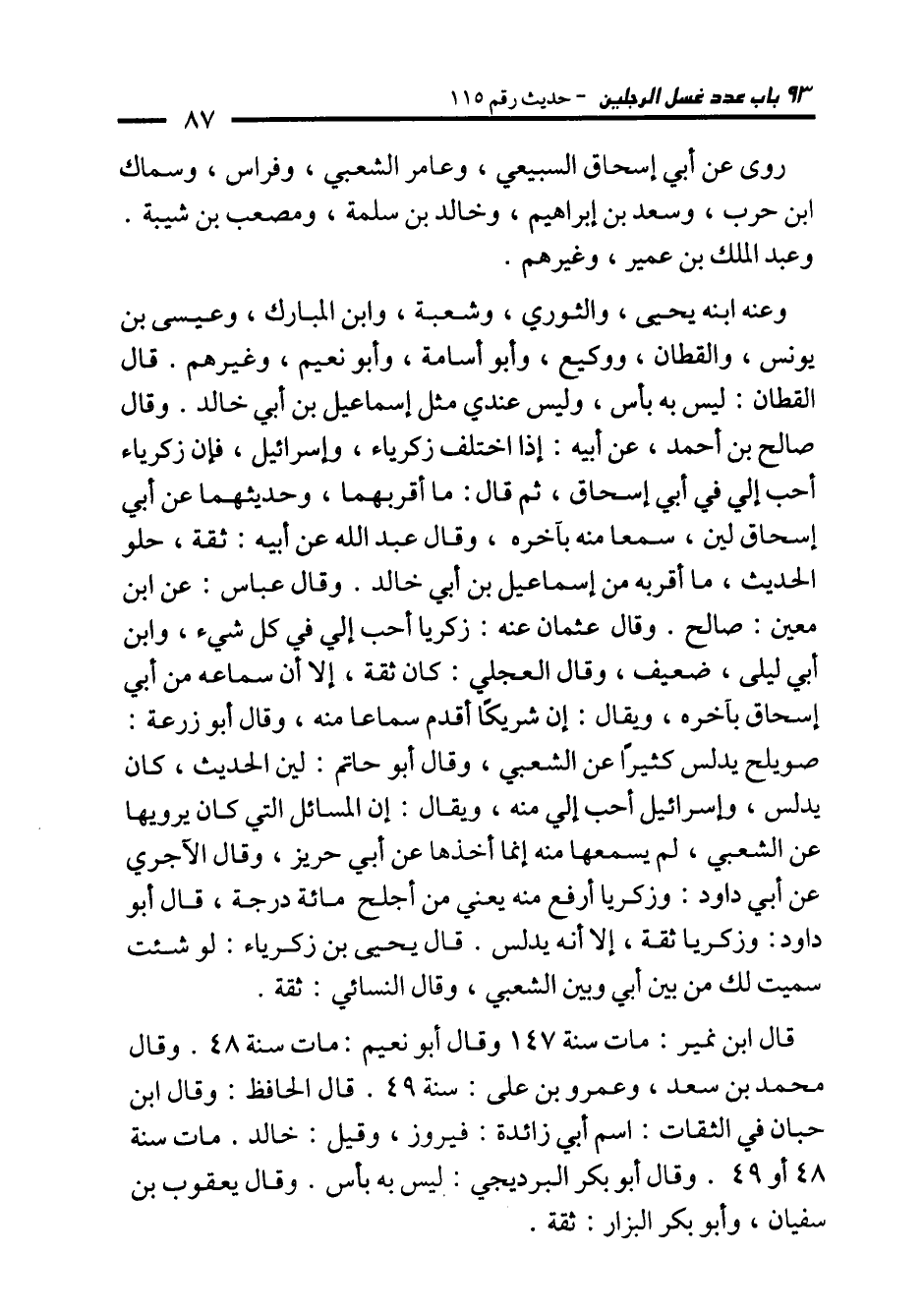 وعنه ابنه يحيى، والثوري، وشعبة، وابن المبارك، وعيسى بن يونس، والقطان، ووكيع، وأبو أسامة، وأبو نعيم، وغيرهم. قال القطان: ليس به بأس، وليس عندي مثل إسماعيل بن أبي خالد. وقال صالح بن أحمد، عن أبيه: إذا اختلف زكرياء، وإسرائيل، فإن زكرياء أحب إلى في أبي إسحاق، ثم قال: ما أقربهما، وحديثهما عن أبي إسحاق لين، سمعا منه بآخره، وقال عبد الله عن أبيه: ثقة، حلو الحديث، ما أقربه من إسماعيل بن أبي خالد. وقال عباس: عن ابن معين: صالح. وقال عثمان عنه: زكريا أحب إلى في كل شيء، وابن أبي ليلى، ضعيف، وقال العجلي: كان ثقة، إلا أن سماعه من أبي إسحاق بآخره، ويقال: إن شريكا أقدم سماعا منه، وقال أبو زرعة: صويلح يدلس كثيرًا عن الشعبي، وقال أبو حاتم: لين الحديث، كان يدلس، وإسرائيل أحب إلى منه، ويقال: إن المسائل التي كان يرويها عن الشعبي، لم يسمعها منه إنما أخذها عن أبي حريز، وقال الآجري عن أبي داود: وزكريا أرفع منه يعني من أجلح مائة درجة، قال أبو داود: وزكريا ثقة، إلا أنه يدلس. قال يحيى بن زكرياء: لو شئت سميت لك من بين أبي وبين الشعبي، وقال النسائي: ثقة.