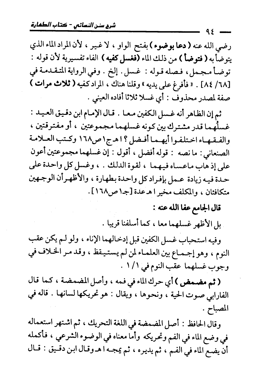 ثم إن الظاهر أنه غسل الكفين معا. قال الإمام ابن دقيق العيد: غسلُهما قدر مشترك بين كونه غسلهما مجموعتين، أو مفترقتين، والفقهاء اختلفوا أيهما أفضل؟ اهـ جـ 1 ص 168 وكتب العلامة الصنعاني: ما نصه: قوله أفضل، أقول: إن غسلهما مجموعتين أعون على إذهاب ما عساه فيهما، لقوة الدلك.، وغسل كل واحدة على حدة فيه زيادة عمل بإفراد كل واحدة بطهارة، والأظهر أن الوجهين متكافئان، والمكلف مخير اهـ عدة [جـ 1 ص 168].