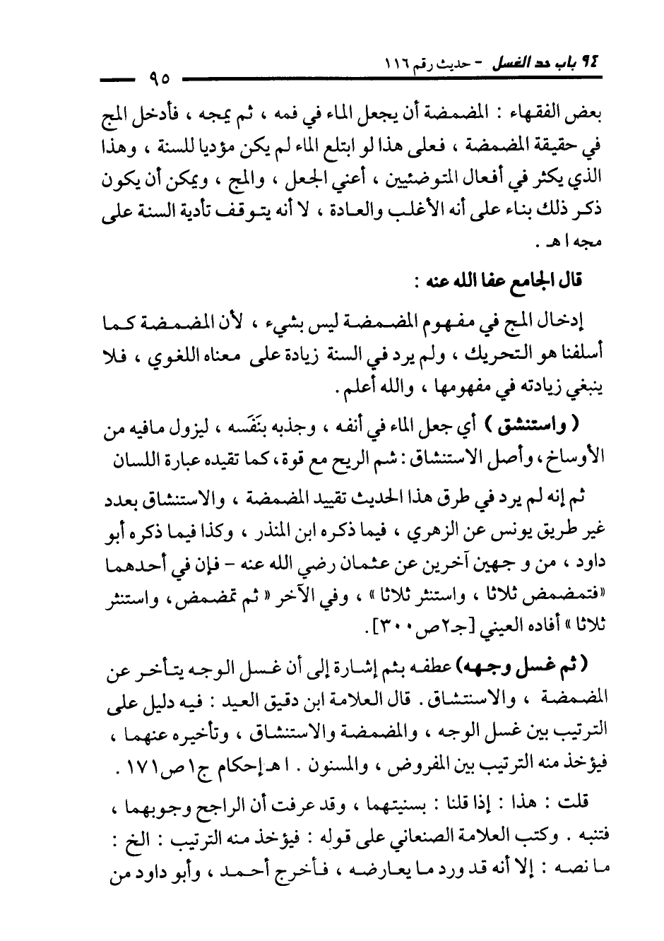 (ثم غسل وجهه) عطفه بثم إشارة إلى أن غسل الوجه يتأخر عن المضمضة، والاستنشاق. قال العلامة ابن دقيق العيد: فيه دليل على الترتيب بين غسل الوجه، والمضمضة والاستنشاق، وتأخيره عنهما، فيؤخذ منه الترتيب بين المفروض، والمسنون. اهـ إحكام ج 1 ص 171.