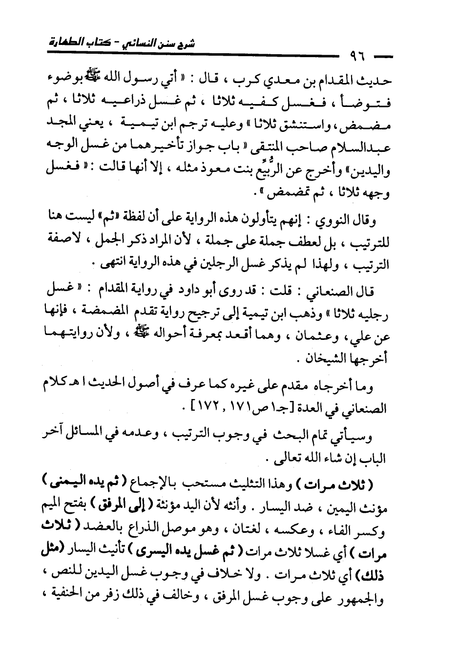 قال الصنعاني: قلت: قد روى أبو داود في رواية المقدام: "غسل رجليه ثلاثا" وذهب ابن تيمية إلى ترجيح رواية تقدم المضمضة، فإنها عن علي، وعثمان، وهما أقعد بمعرفة أحواله - صلى الله عليه وسلم -، ولأن روايتهما أخرجها الشيخان.