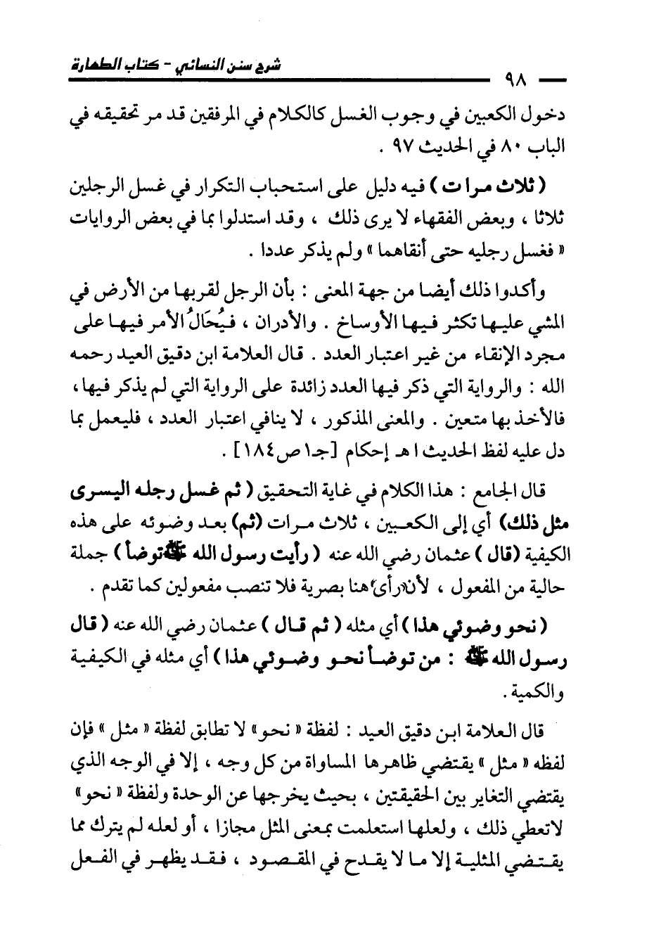 (ثلاث مرات) فيه دليل على استحباب التكرار في غسل الرجلين ثلاثا، وبعض الفقهاء لا يرى ذلك، وقد استدلوا بما في بعض الروايات "فغسل رجليه حتى أنقاهما" ولم يذكر عددا.