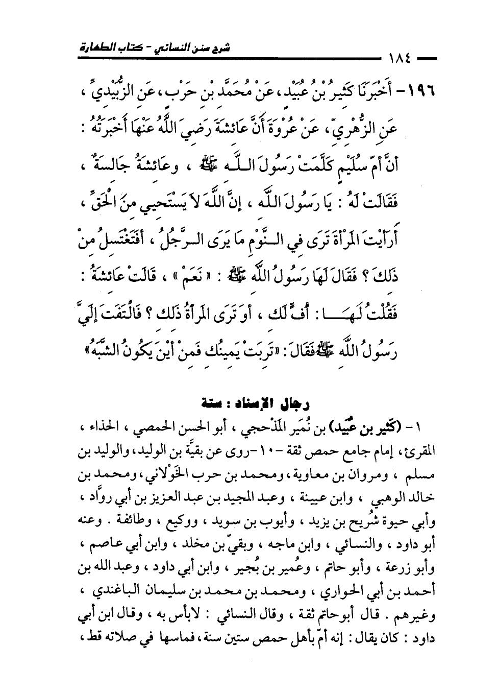 196 - أَخْبَرَنَا كَثِيرُ بْنُ عُبَيْدٍ، عَنْ مُحَمَّدِ بْنِ حَرْبٍ، عَنِ الزُّبَيْدِيِّ، عَنِ الزُّهْرِيِّ، عَنْ عُرْوَةَ أَنَّ عَائِشَةَ رَضِيَ اللهُ عَنْهَا أَخْبَرَتْهُ: أَنَّ أُمَّ سُلَيْمٍ كَلَّمَتْ رَسُولَ اللهِ - صلى الله عليه وسلم -، وَعَائِشَةُ جَالِسَةٌ، فَقَالَتْ لَهُ: يَا رَسُولَ اللهِ إِنَّ اللهَ لاَ يَسْتَحْيِي مِنَ الْحَقِّ، أَرَأَيْتَ الْمَرْأَةَ تَرَى فِي النَّوْمِ مَا يَرَى الرَّجُلُ، أَفَتَغْتَسِلُ مِنْ ذَلِكَ؟ فَقَالَ لَهَا رَسُولُ اللهِ - صلى الله عليه وسلم -: "نَعَمْ". قَالَتْ عَائِشَةُ: فَقُلْتُ لَهَا: أُفٍّ لَكِ، أَوَ تَرَى الْمَرْأَةُ ذَلِكِ؟ فَالْتَفَتَ إِلَيَّ رَسُولُ اللهِ - صلى الله عليه وسلم - فَقَالَ: "تَرِبَتْ يَمِينُكِ فَمِنْ أَيْنَ يَكُونُ الشَّبَهُ".