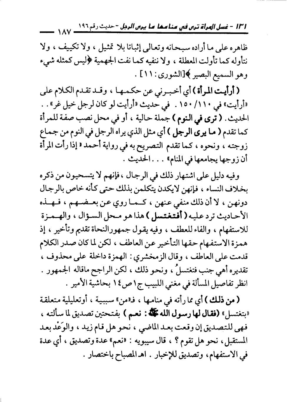وفيه دليل على اشتهار ذلك في الرجال، فإنهم لا يتسحيون من ذكره بخلاف النساء، فإنهن لا يكدن يتكلمن بذلك حتى كأنه خاص بالرجال دونهن، لا أن ذلك منفي عنهن، كما روي عن بعضهم، فهذه الأحاديث ترد عليه (أفتغتسل) هذا هو محل السؤال، والهمزة للاستفهام، والفاء للعطف، وفيه يقول جمهور النحاة تقديم وتأخير، إذ همزة الاستفهام حقها التأخير عن العاطف، لكن لما كان صدر الكلام قدمت على العاطف، وقال الزمخشري: الهمزة داخلة على محذوف، تقديره أهي جنب فتغتسلُ، ونحو ذلك، لكن الراجح ما قاله الجمهور. انظر تفاصيل المسألة في مغني اللبيب ج 1 ص 14 بحاشية الأمير.