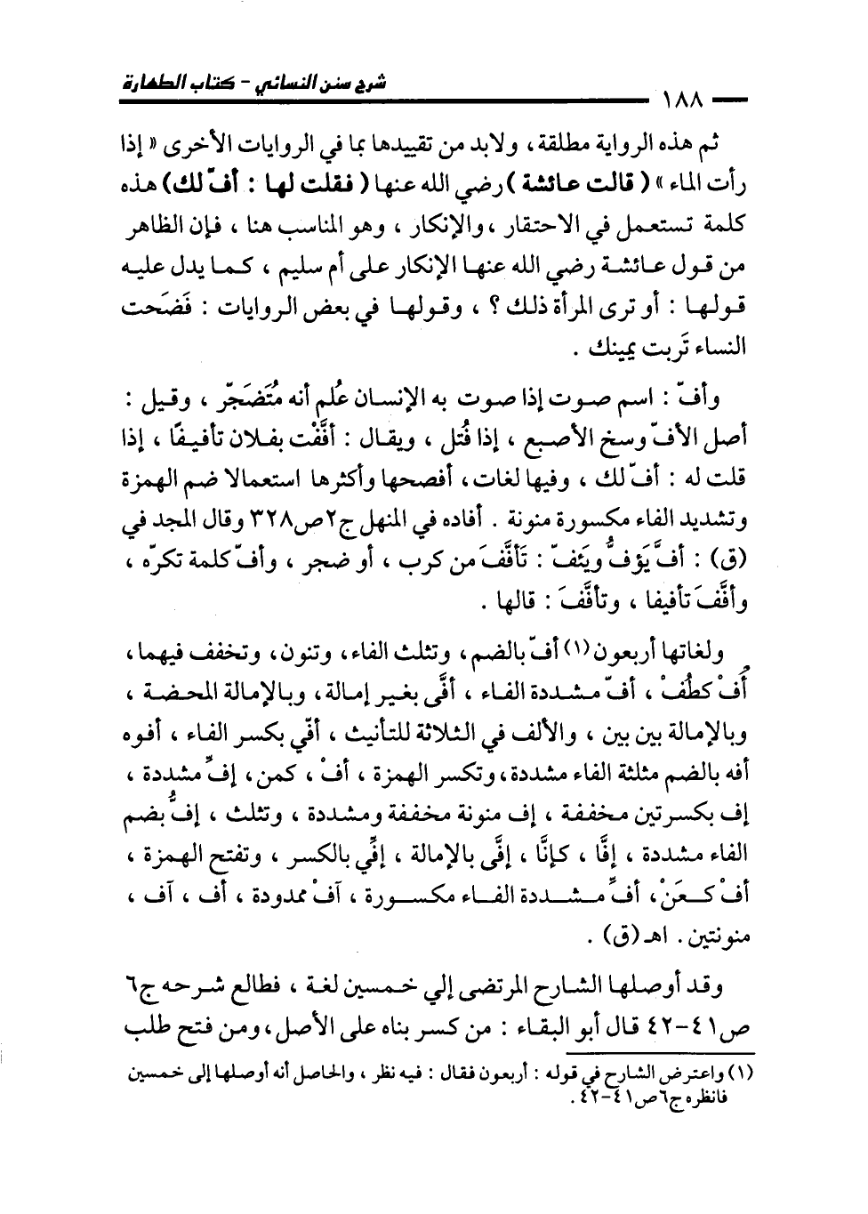 وتشديد الفاء مكسورة منونة. أفاده في المنهل ج 2 ص 328 وقال المجد في (ق): أفَّ يَؤفُّ ويَئفّ: تَأفَّفَ من كرب، أو ضجر، وأفّ كلمة تكرّه، وأفَّفَ تأفيفا، وتأفَّفَ: قالها.
