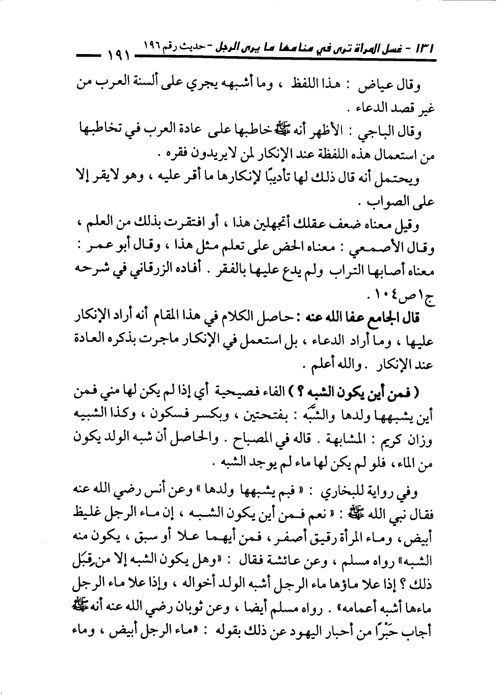 وفي رواية للبخاري: "فبم يشبهها ولدها" وعن أنس رضي الله عنه فقال نبي الله - صلى الله عليه وسلم -: "نعم فمن أين يكون الشبه، إن ماء الرجل غليظ أبيض، وماء المرأة رقيق أصفر، فمن أيهما علا أو سبق، يكون منه الشبه" رواه مسلم، وعن عائشة فقال: "وهل يكون الشبه إلا من قِبَل ذلك؟ إذا علا ماؤها ماء الرجل أشبه الولد أخواله، وإذا علا ماء الرجل ماءها أشبه أعمامه". رواه مسلم أيضا، وعن ثوبان رضي الله عنه أنه - صلى الله عليه وسلم - أجاب حَبْرًا من أحبار اليهود عن ذلك بقوله: "ماء الرجل أبيض، وماء