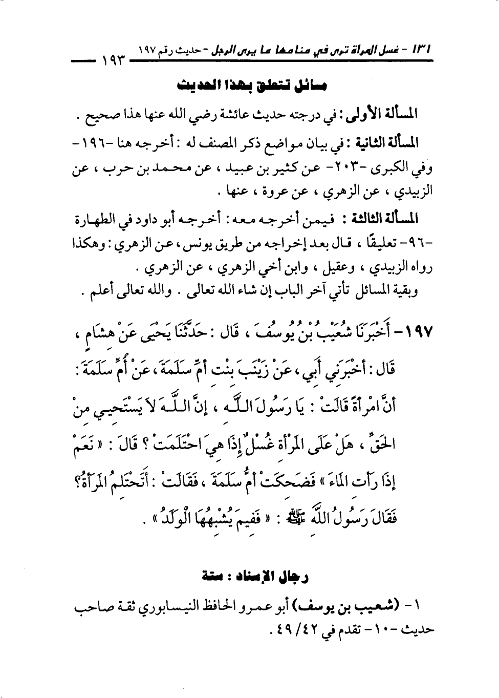 197 - أَخْبَرَنَا شُعَيْبُ بْنُ يُوسُفَ، قَالَ: حَدَّثَنَا يَحْيَى عَنْ هِشَامٍ، قَالَ: أَخْبَرَنِي أَبِي، عَنْ زَيْنَبَ بِنْتِ أُمِّ سَلَمَةَ، عَنْ أُمِّ سَلَمَةَ: أَنَّ امْرَأَةً قَالَتْ: يَا رَسُولَ اللهِ، إِنَّ اللهَ لاَ يَسْتَحْيِي مِنَ الْحَقِّ، هَلْ عَلَى الْمَرْأَةِ غُسْلٌ إِذَا هِيَ احْتَلَمَتْ؟ قَالَ: "نَعَمْ إِذَا رَأَتِ الْمَاءَ". فَضَحِكَتْ أُمُّ سَلَمَةَ، فَقَالَتْ: أَتَحْتَلِمُ الْمَرْأَةُ؟ فَقَالَ رَسُولُ اللهِ - صلى الله عليه وسلم -: "فَفِيمَ يُشْبِهُهَا الْوَلَدُ".