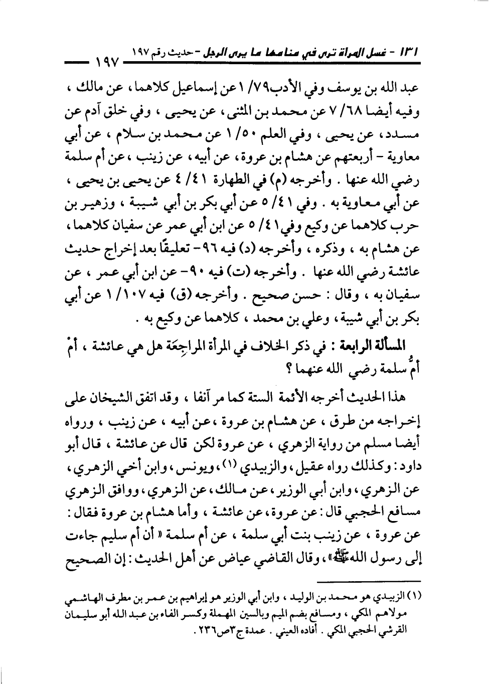 عبد الله بن يوسف وفي الأدب 79/ 1 عن إسماعيل كلاهما، عن مالك، وفيه أيضا 68/ 7 عن محمَّد بن المثنى، عن يحيى، وفي خلق آدم عن مسدد، عن يحيى، وفي العلم 50/ 1 عن محمَّد بن سلام، عن أبي معاوية- أربعتهم عن هشام بن عروة، عن أبيه، عن زينب، عن أم سلمة رضي الله عنها. وأخرجه (م) في الطهارة 41/ 4 عن يحيى بن يحيى، عن أبي معاوية به. وفي 41/ 5 عن أبي بكر بن أبي شيبة، وزهير بن حرب كلاهما عن وكيع وفي 41/ 5 عن ابن أبي عمر عن سفيان كلاهما، عن هشام به، وذكره، وأخرجه (د) فيه 96 - تعليقًا بعد إخراج حديث عائشة رضي الله عنها. وأخرجه (ت) فيه 90 - عن ابن أبي عمر، عن سفيان به، وقال: حسن صحيح. وأخرجه (ق) فيه 107/ 1 عن أبي بكر بن أبي شيبة، وعلي بن محمَّد، كلاهما عن وكيع به.