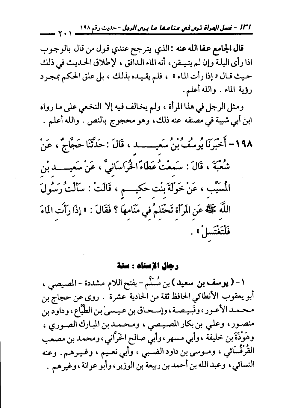 198 - أَخْبَرَنَا يُوسُفُ بْنُ سَعِيدٍ، قَالَ: حَدَّثَنَا حَجَّاجٌ، عَنْ شُعْبَةَ، قَالَ: سَمِعْتُ عَطَاءً الْخُرَاسَانِيَّ، عَنْ سَعِيدِ بْنِ الْمُسَيَّبِ، عَنْ خَوْلَةَ بِنْتِ حَكِيمٍ، قَالَتْ: سَأَلْتُ رَسُولَ اللهِ - صلى الله عليه وسلم - عَنِ الْمَرْأَةِ تَحْتَلِمُ فِي مَنَامِهَا؟ فَقَالَ: "إِذَا رَأَتِ الْمَاءَ فَلْتَغْتَسِلْ".