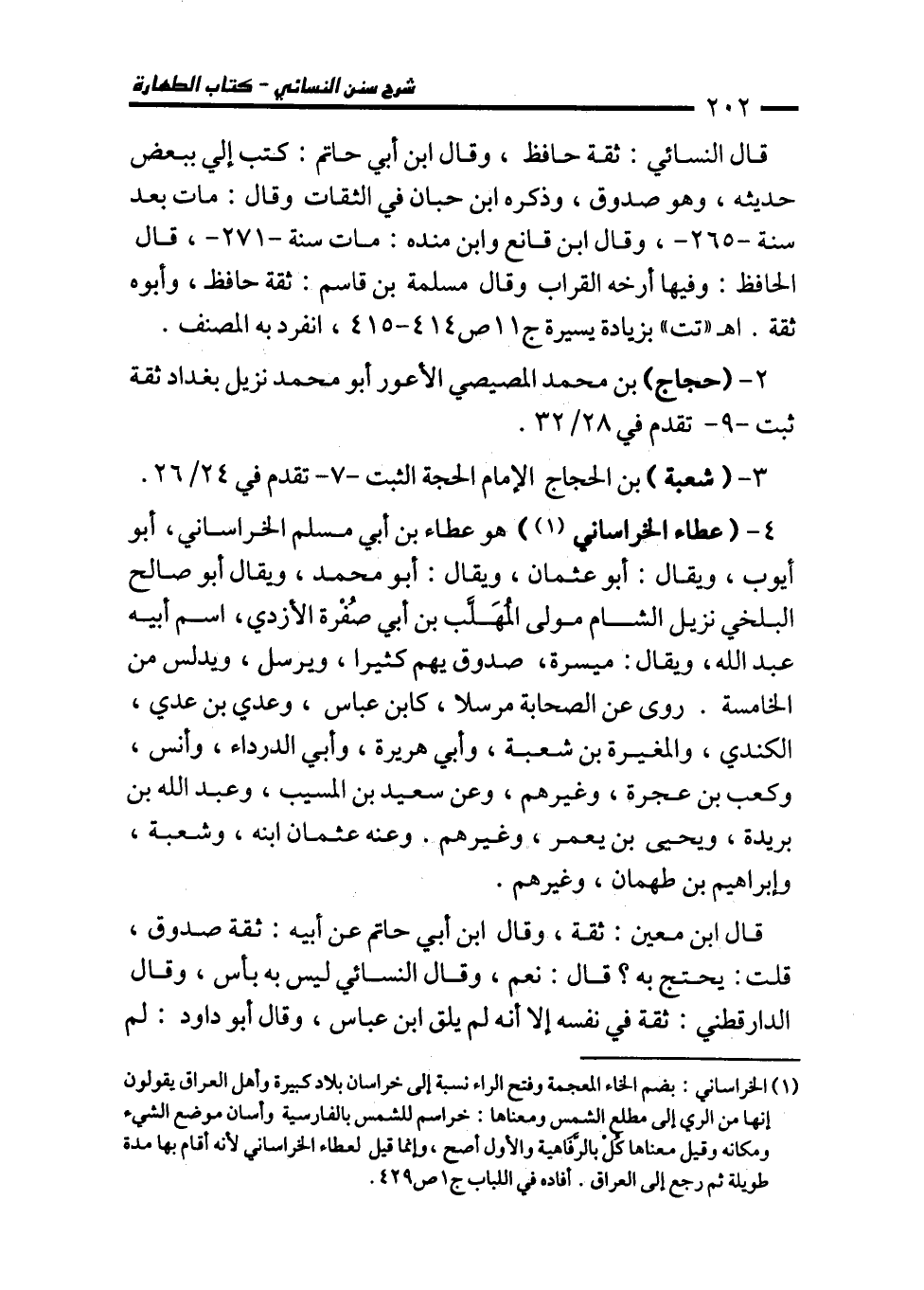 (¬1) الخراساني: بضم الخاء المعجمة وفتح الراء نسبة إلى خراسان بلاد كبيرة وأهل العراق يقولون إنها من الري إلى مطلع الشمس ومعناها: خراسم للشمس بالفارسية وأسان موضع الشيء ومكانه وقيل معناها كُلْ بالرَّفَاهية والأول أصح، وإنما قيل لعطاء الخراساني لأنه أقام بها مدة طويلة ثم رجع إلى العراق. أفاده في اللباب ج 1 ص 429.