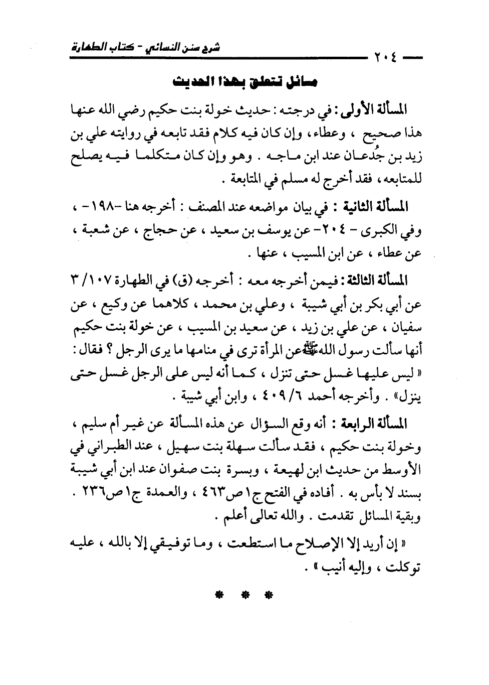 المسألة الرابعة: أنه وقع السؤال عن هذه المسألة عن غير أم سليم، وخولة بنت حكيم، فقد سألت سهلة بنت سهيل، عند الطبراني في الأوسط من حديث ابن لهيعة، وبسرة بنت صفوان عند ابن أبي شيبة بسند لا بأس به. أفاده في الفتح ج 1 ص 463، والعمدة ج 1 ص 236. وبقية المسائل تقدمت. والله تعالى أعلم.