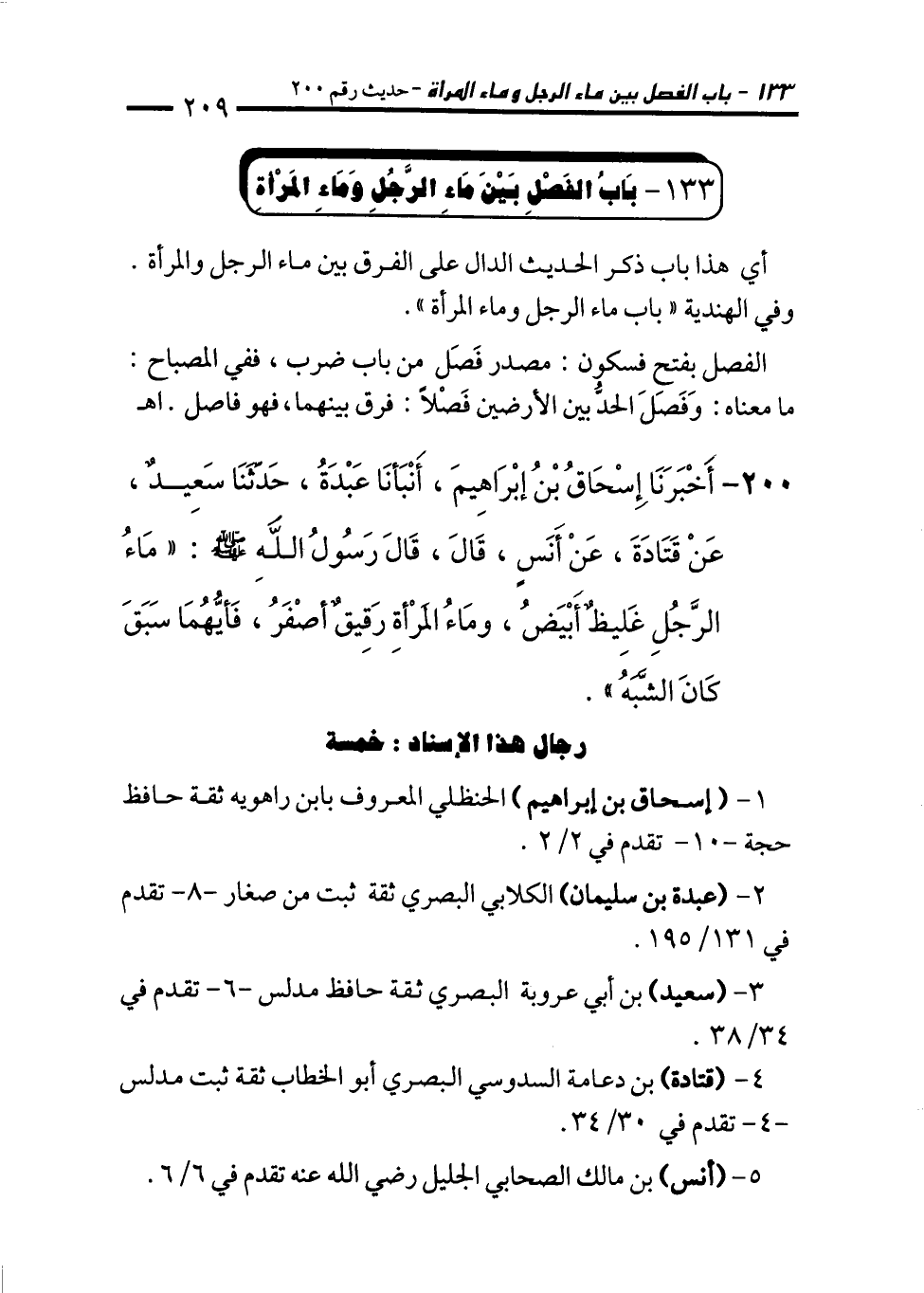 200 - أَخْبَرَنَا إِسْحَاقُ بْنُ إِبْرَاهِيمَ، أَنْبَأَنَا عَبْدَةُ، حَدَّثَنَا سَعِيدٌ، عَنْ قَتَادَةَ، عَنْ أَنَسٍ، قَالَ، قَالَ رَسُولُ اللهِ - صلى الله عليه وسلم -: "مَاءُ الرَّجُلِ غَلِيظٌ أَبْيَضُ، وَمَاءُ الْمَرْأَةِ رَقِيقٌ أَصْفَرُ، فَأَيُّهُمَا سَبَقَ كَانَ الشَّبَهُ".